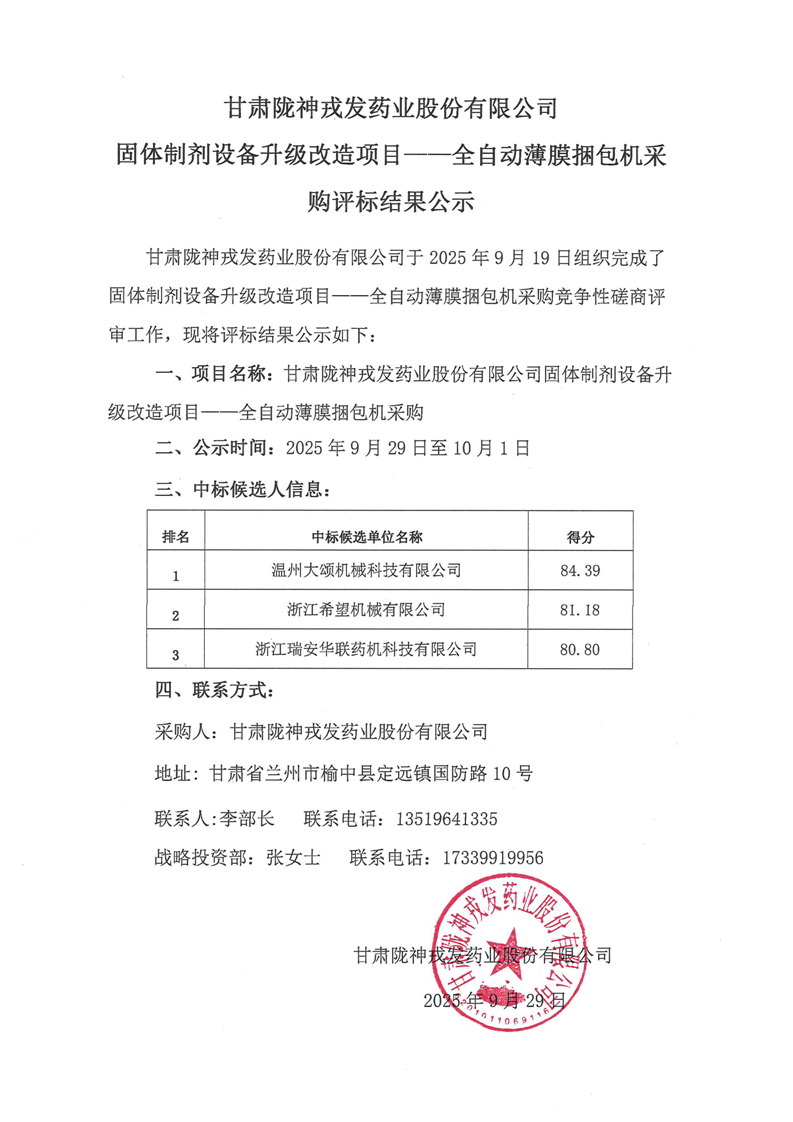 甘肅隴神戎發藥業股份有限公司固體制劑設備升級改造項目——全自動薄膜捆包機采購評標結果公示