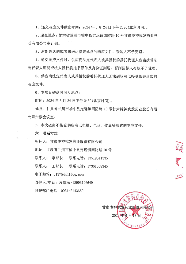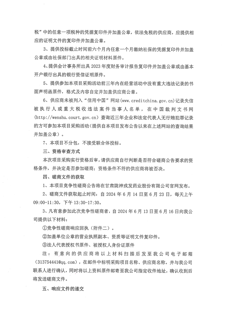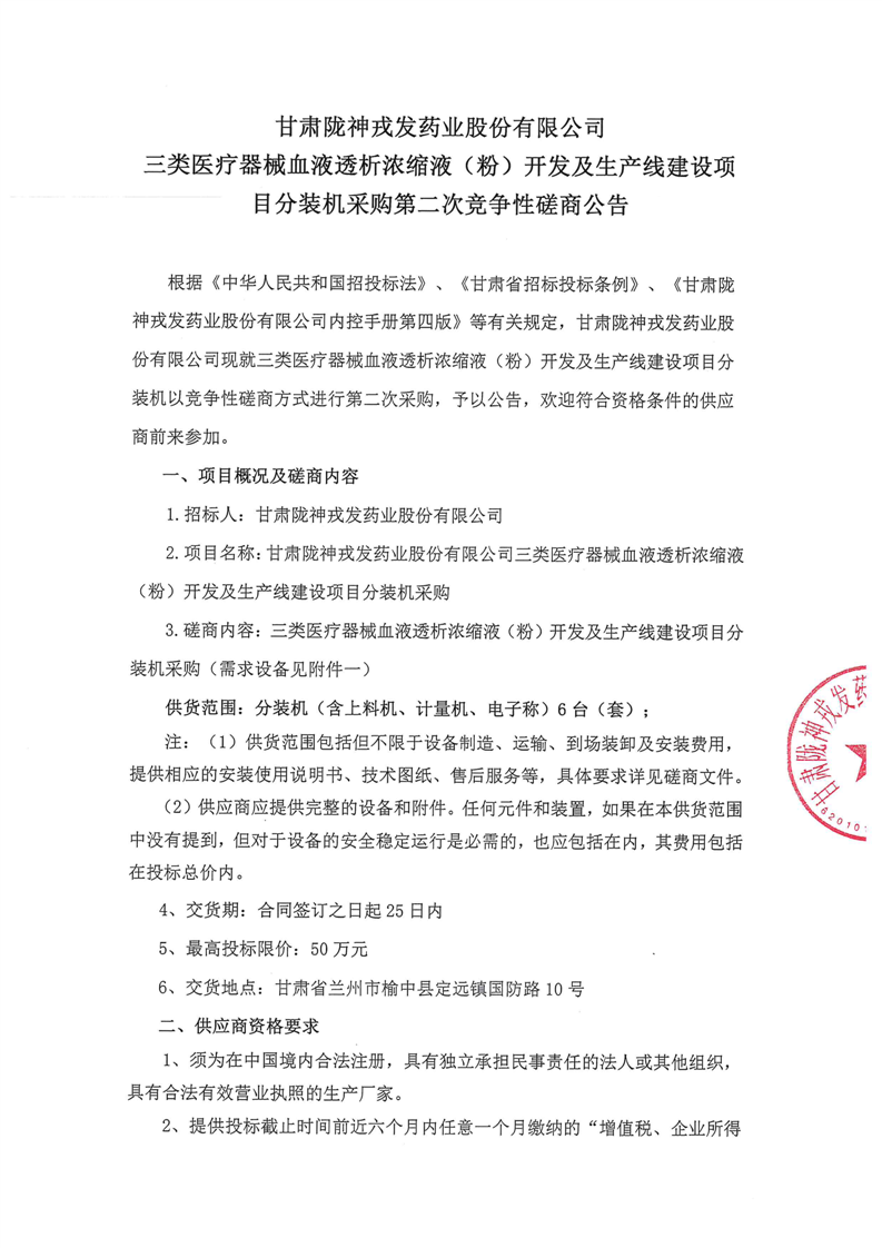 甘肅隴神戎發(fā)藥業(yè)股份有限公司三類醫(yī)療器械血液透析濃縮液(粉)開(kāi)發(fā)及生產(chǎn)線建設(shè)項(xiàng)目分裝機(jī)采購(gòu)第二次競(jìng)爭(zhēng)性磋商公告