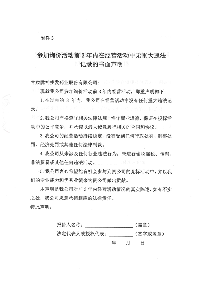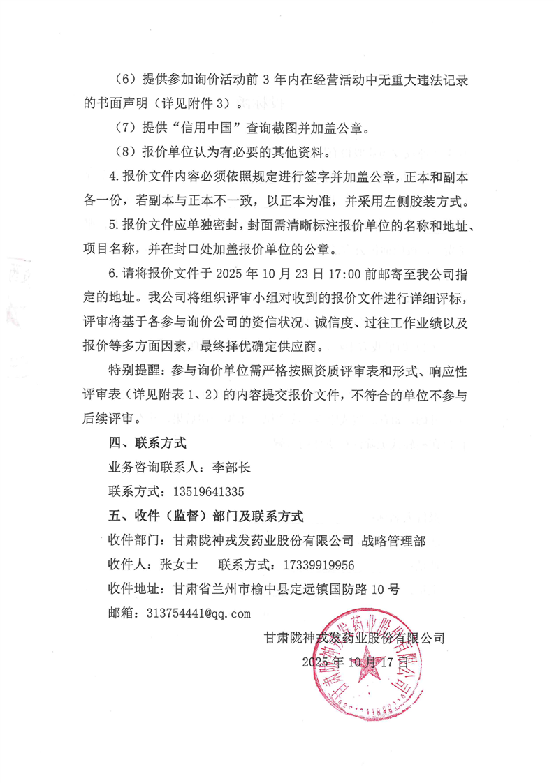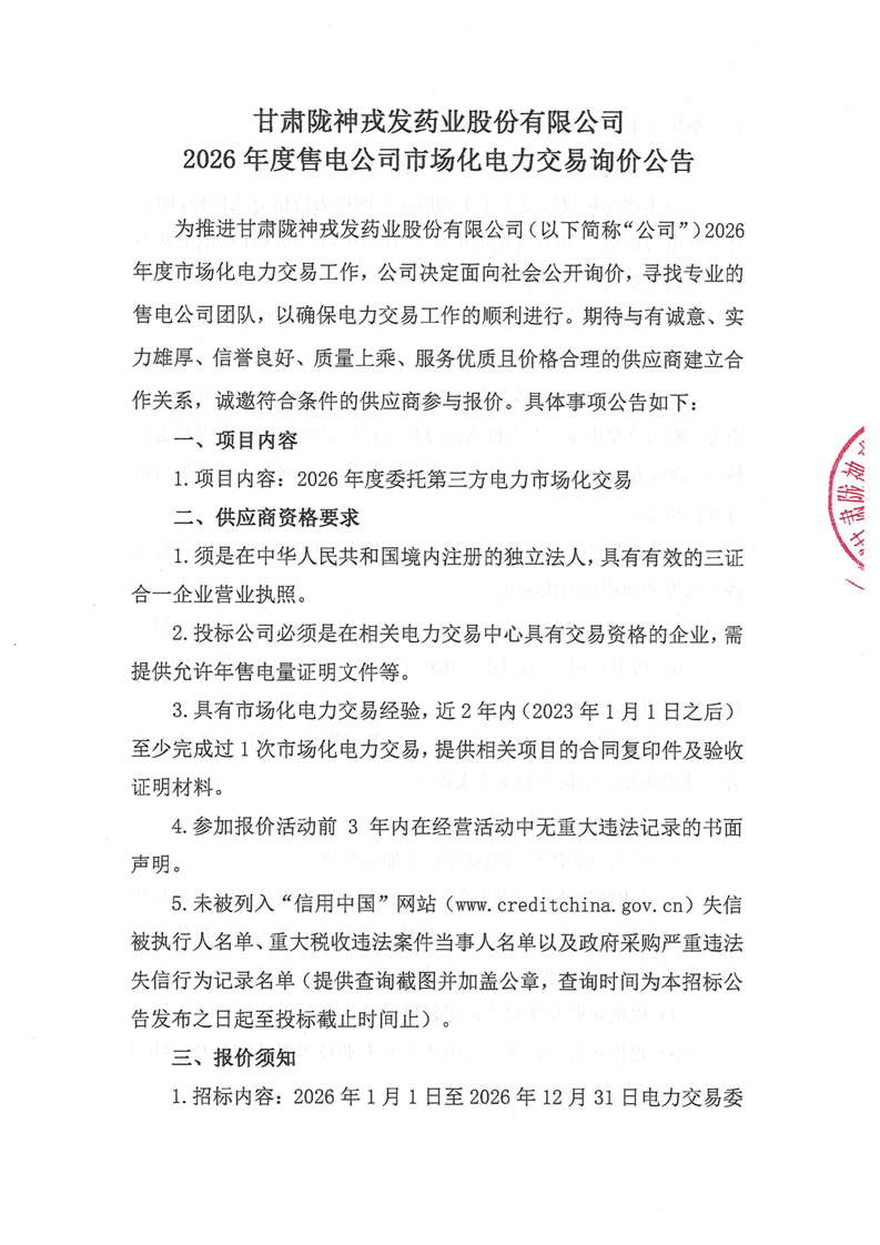 甘肅隴神戎發藥業股份有限公司2026年度售電公司市場化電力交易詢價公告
