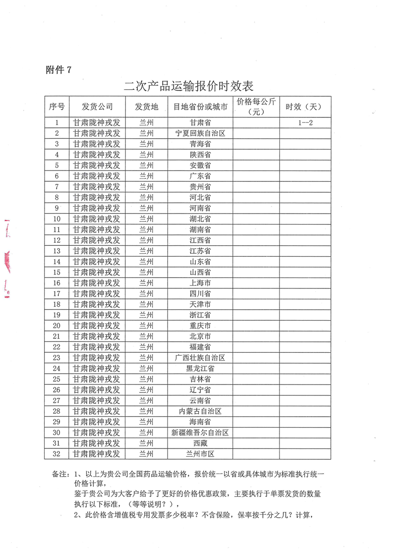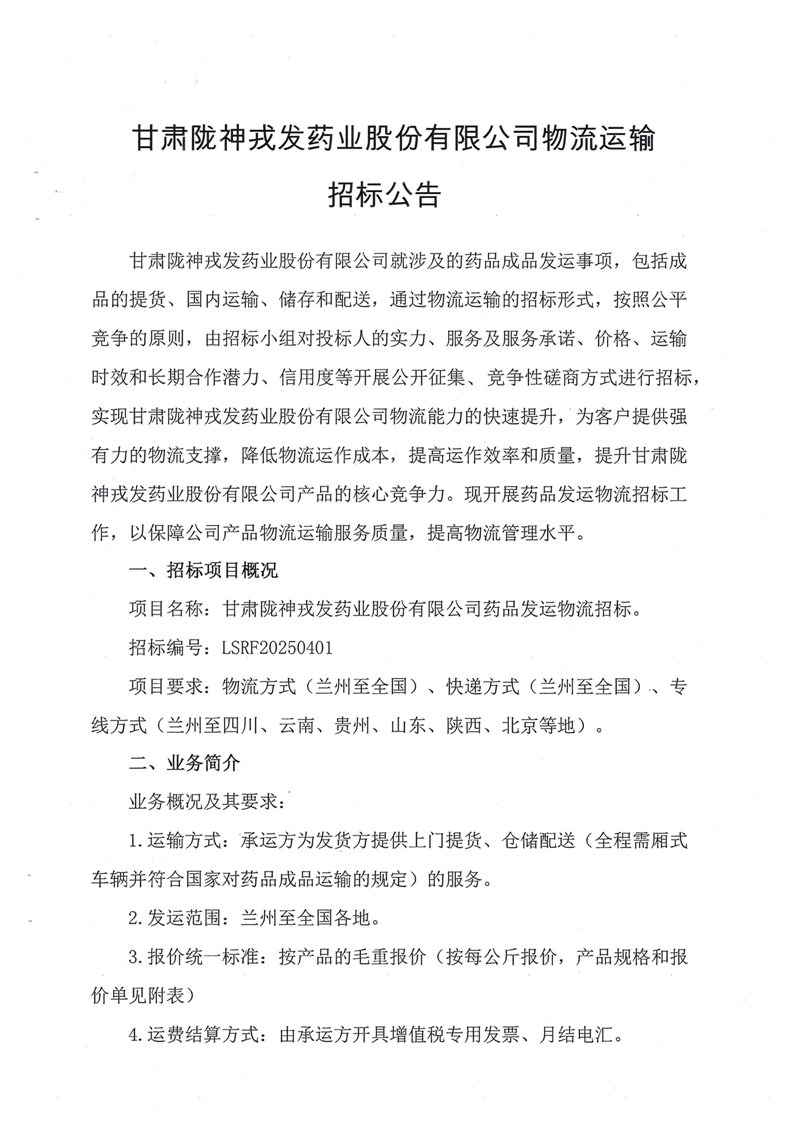 甘肅隴神戎發(fā)藥業(yè)股份有限公司物流運輸招標公告