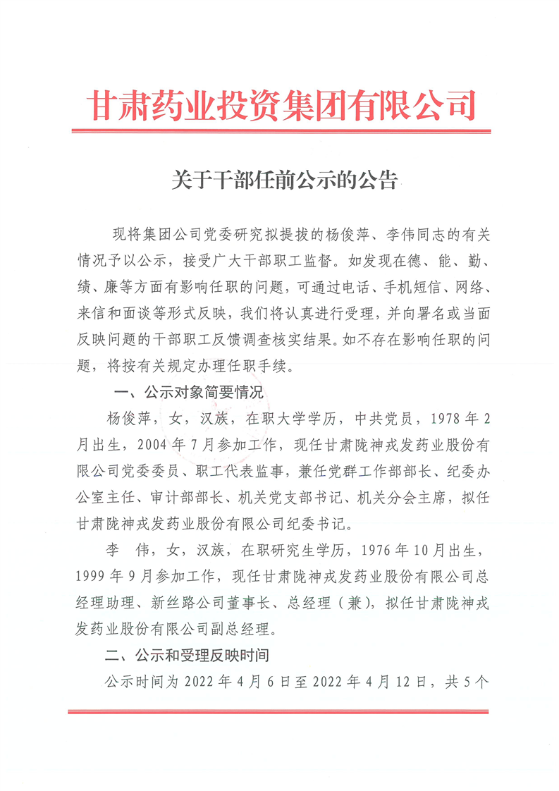 甘肅藥業投資集團有限公司關于干部任前公示的公告
