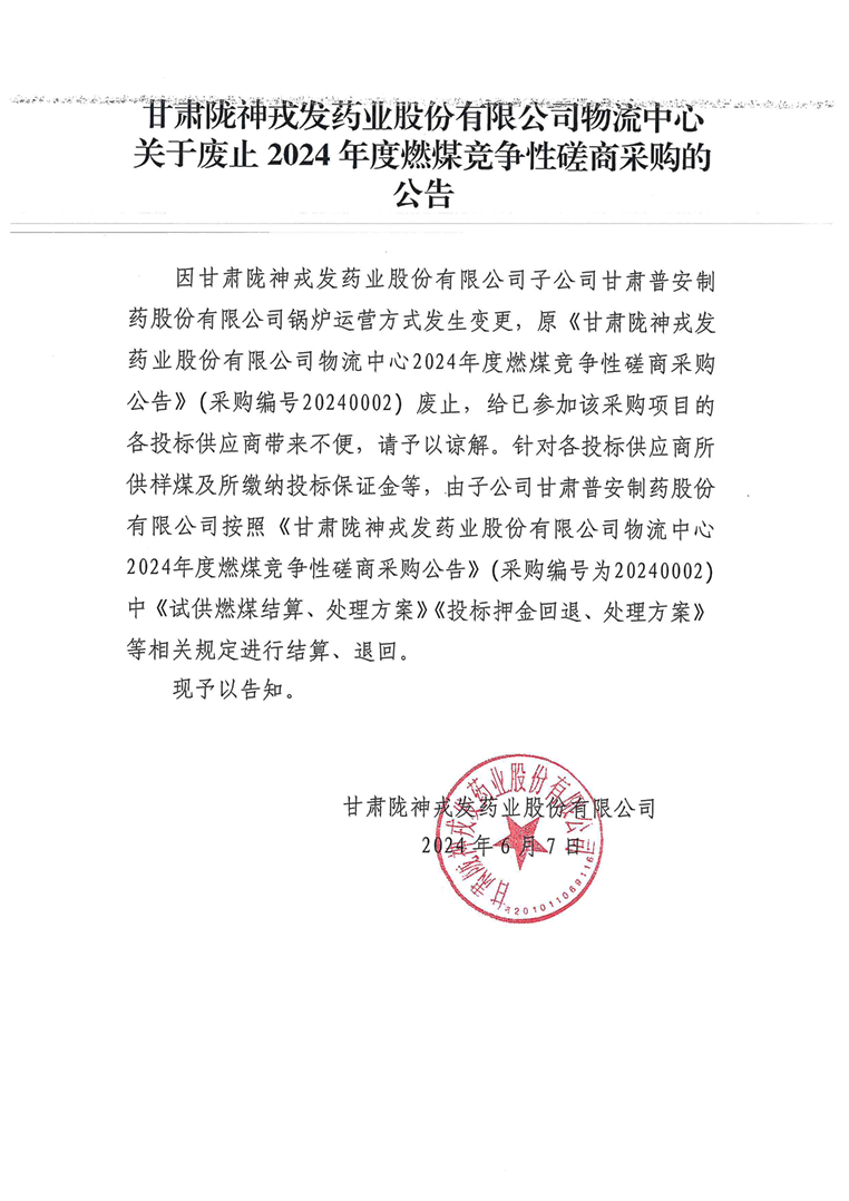 甘肅隴神戎發(fā)藥業(yè)股份有限公司物流中心關(guān)于廢止2024年度燃煤競(jìng)爭(zhēng)性磋商采購(gòu)的公告