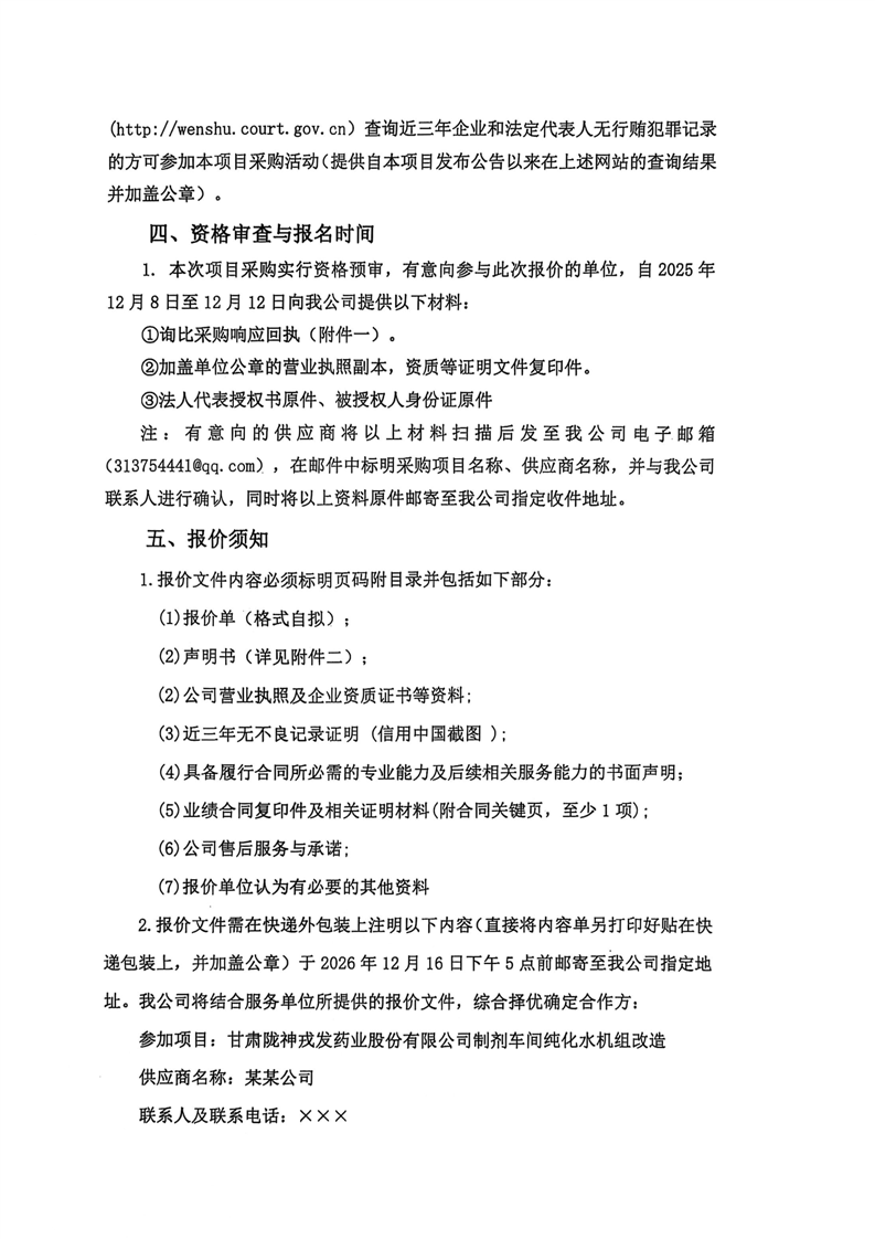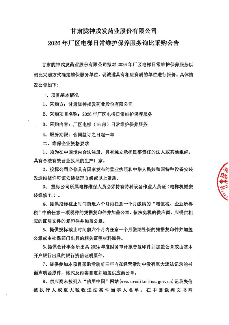 甘肅隴神戎發藥業股份有限公司2026年廠區電梯日常維護保養服務詢比采購公告