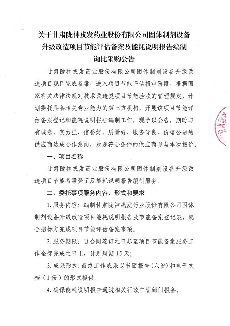 關于甘肅隴神戎發藥業股份有限公司固體制劑設備升級改造項目節能評估備案及能耗說明報告編制詢比采購公告