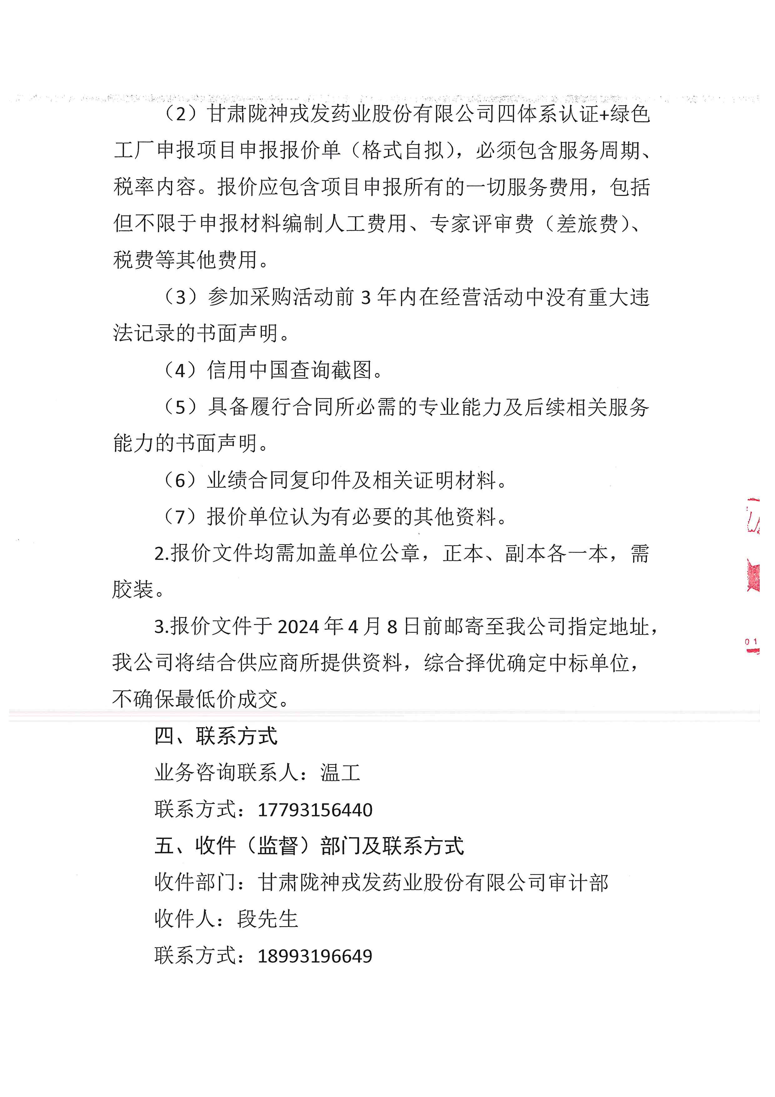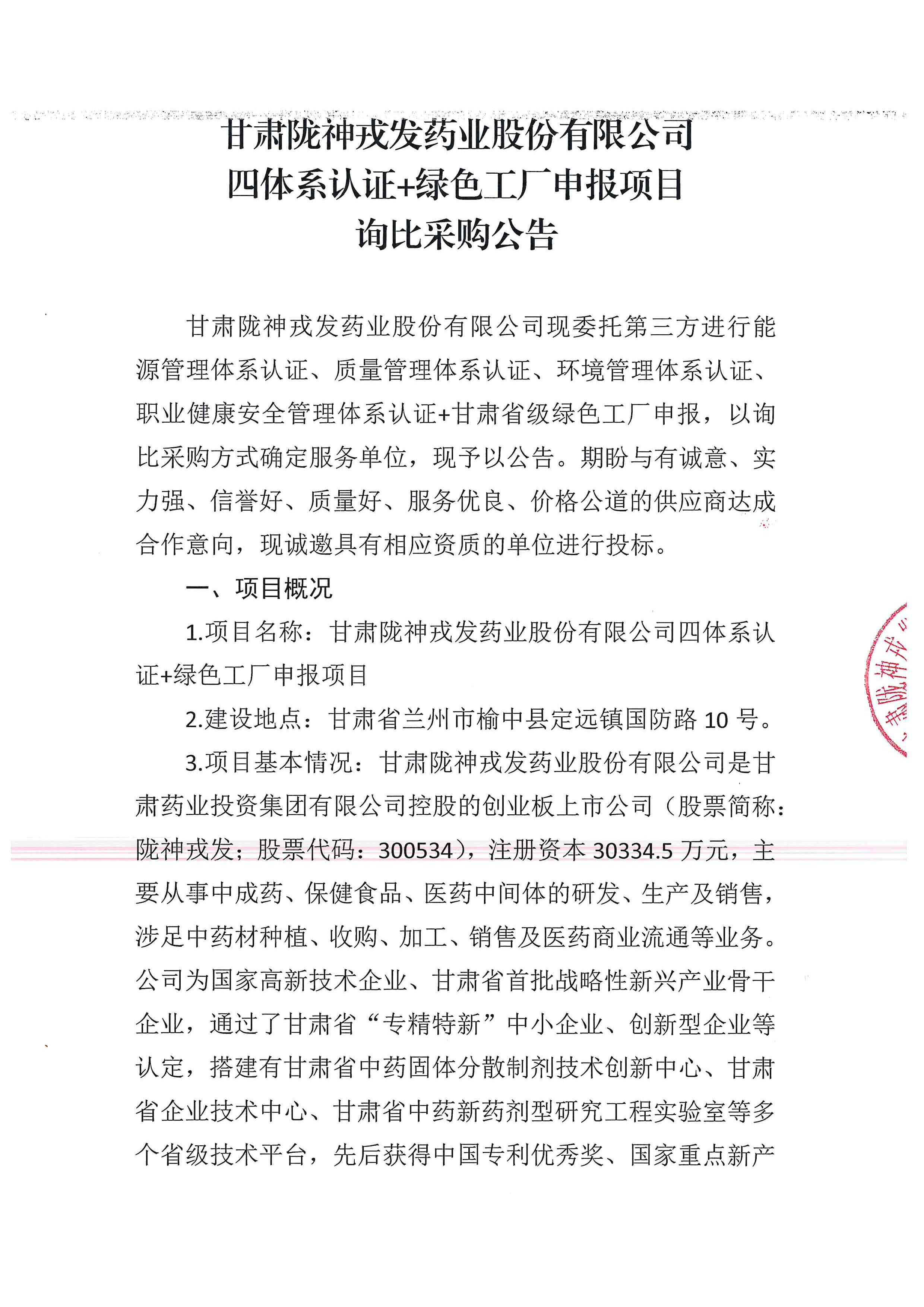 甘肅隴神戎發(fā)藥業(yè)股份有限公司四體系認(rèn)證+綠色工廠申報(bào)項(xiàng)目詢比采購(gòu)公告
