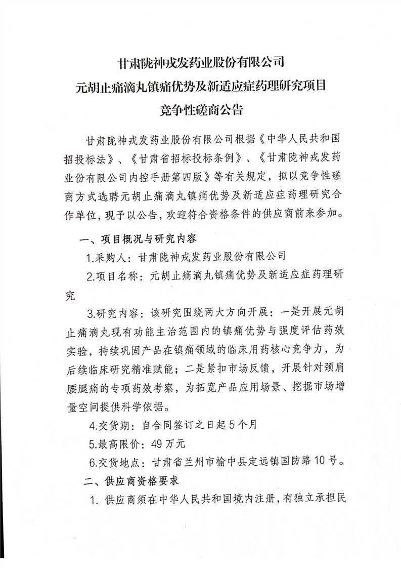甘肅隴神戎發藥業股份有限公司元胡止痛滴丸鎮痛優勢及新適應癥藥理研究項目競爭性磋商公告