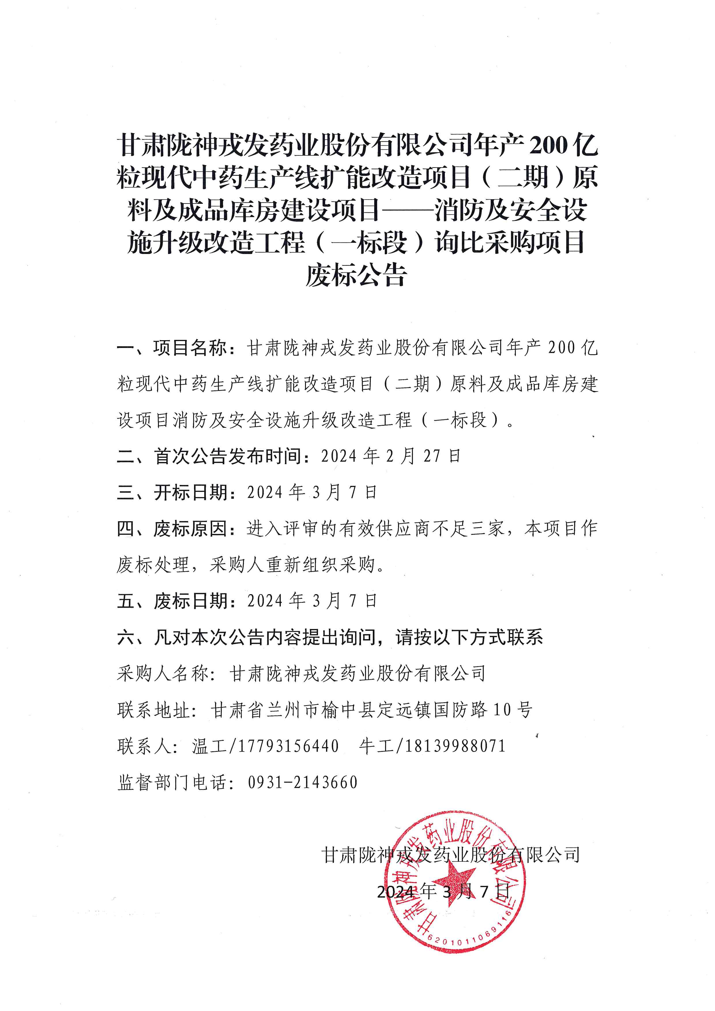 甘肅隴神戎發(fā)藥業(yè)股份有限公司年產(chǎn)200億粒現(xiàn)代中藥生產(chǎn)線擴能改造項目(二期)原料及成品庫房建設(shè)項目--消防及安全設(shè)施升級改造工程(一標(biāo)段)詢比采購項目廢標(biāo)公告