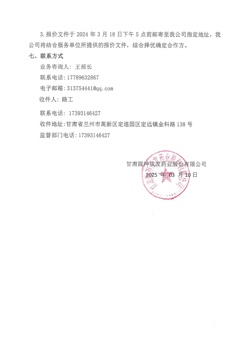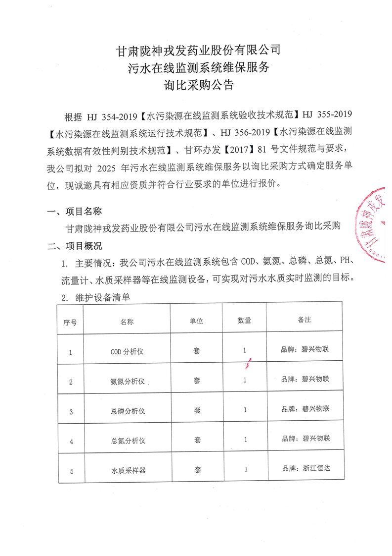 甘肅隴神戎發藥業股份有限公司污水在線監測系統維保服務詢比采購公告