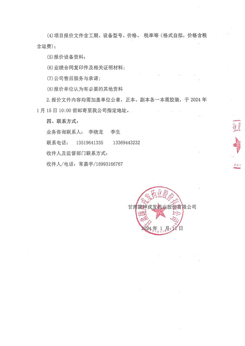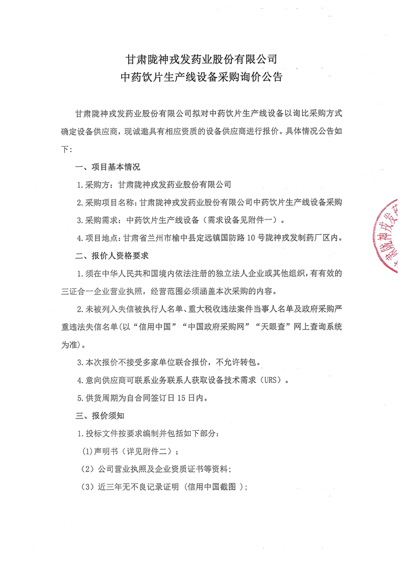 甘肅隴神戎發藥業股份有限公司中藥飲片生產線設備采購詢價公告