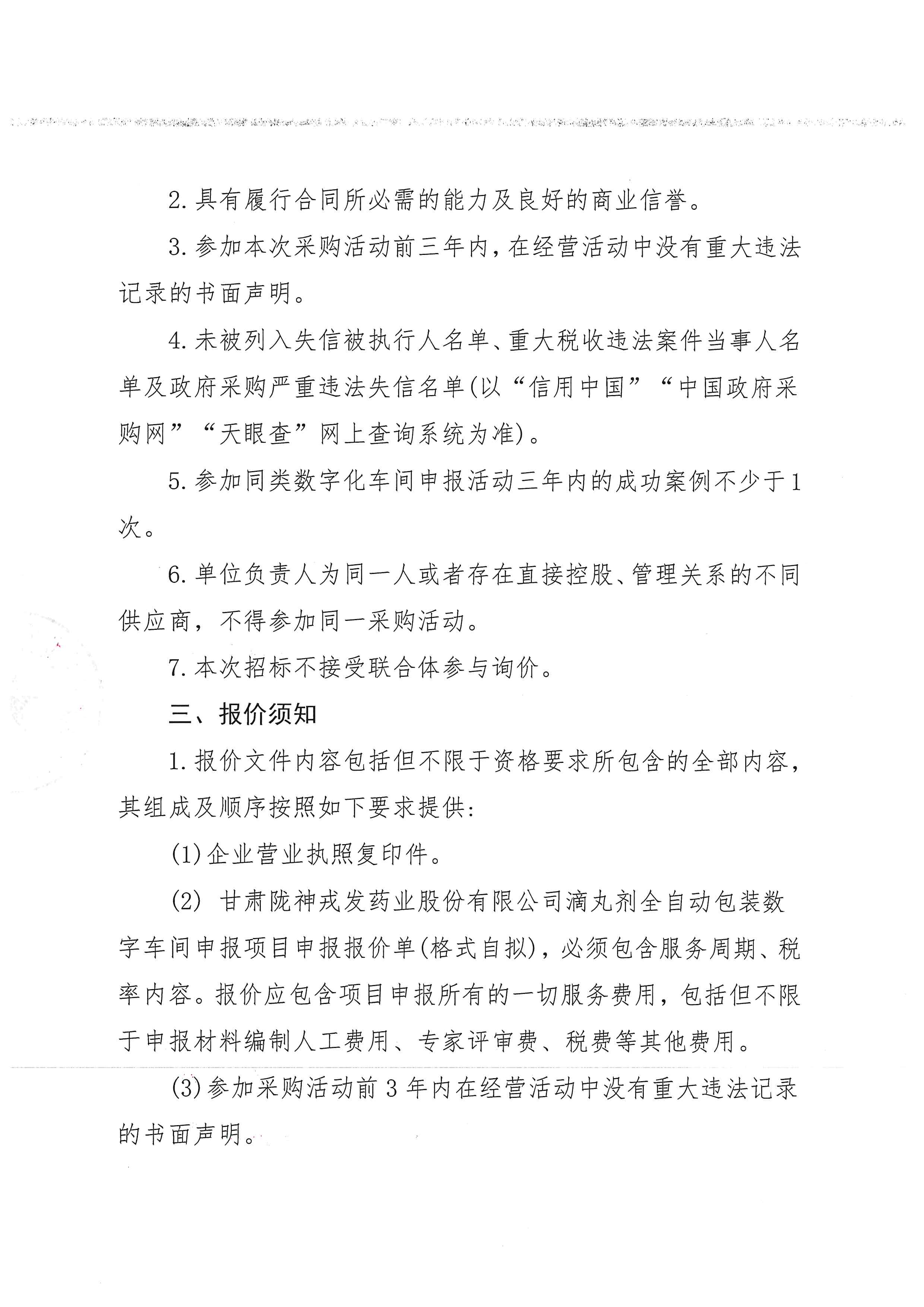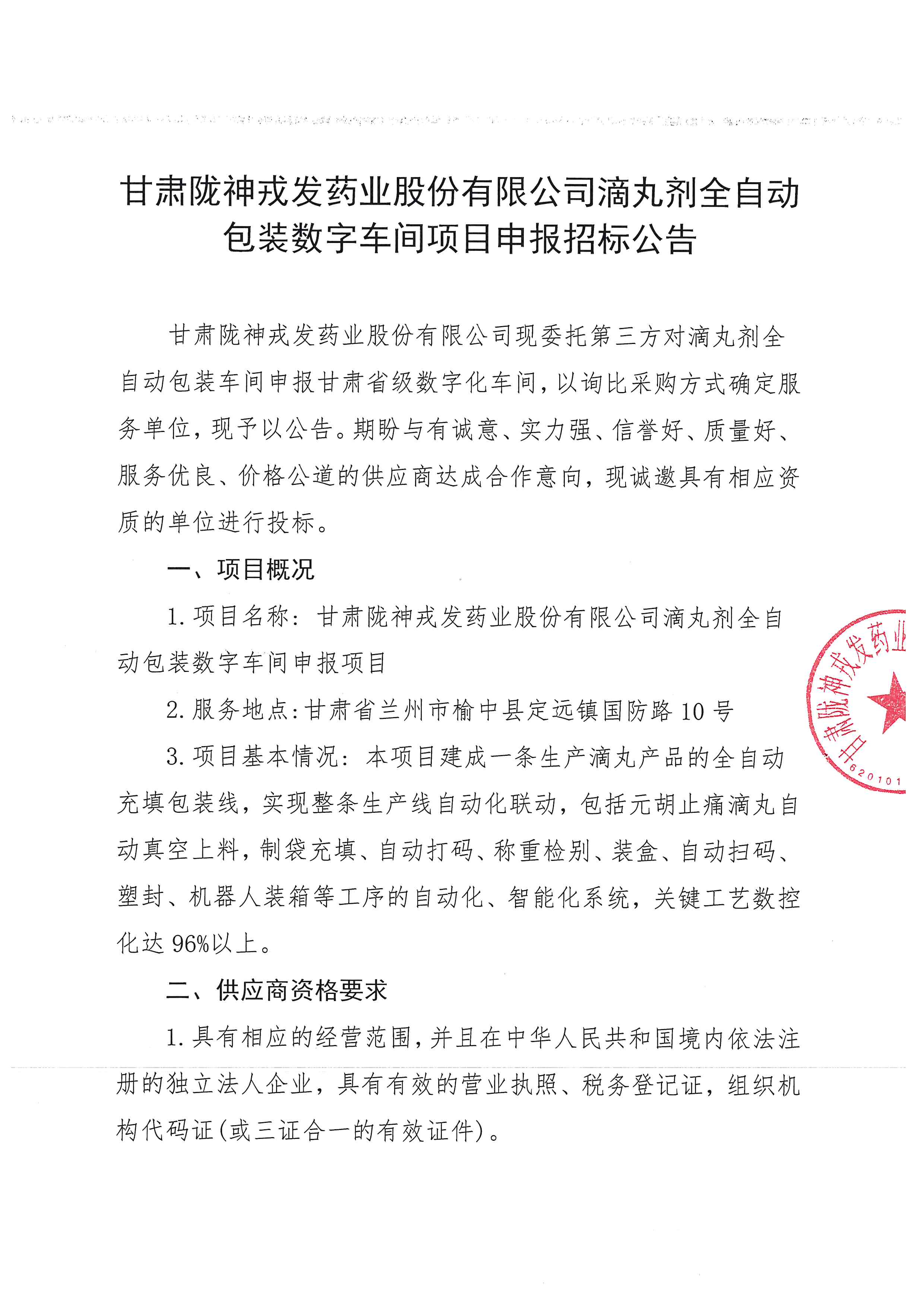 甘肅隴神戎發藥業股份有限公司滴丸劑全自動包裝數字車間項目申報招標公告