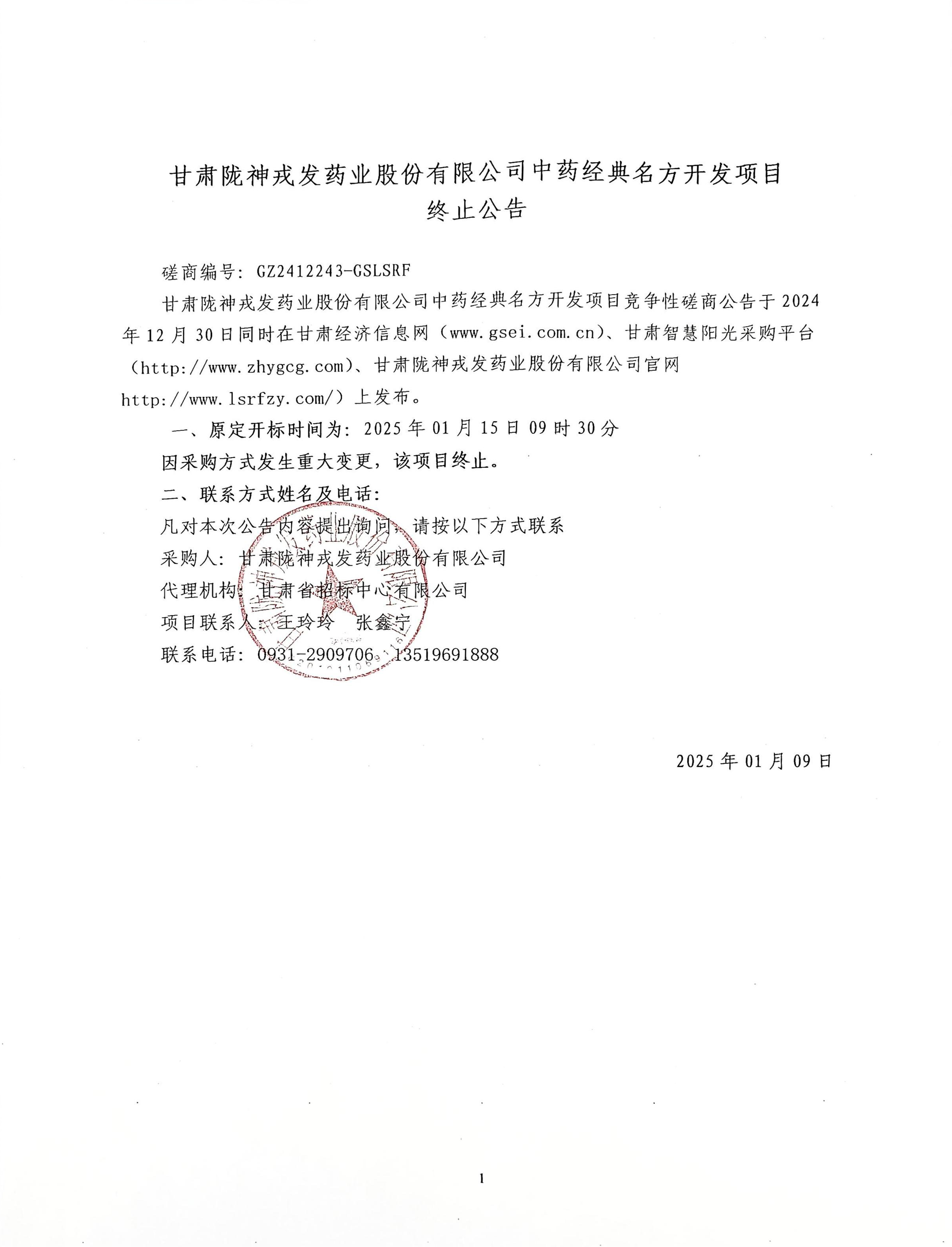 甘肅隴神戎發藥業股份有限公司中藥經典名方開發項目終止公告