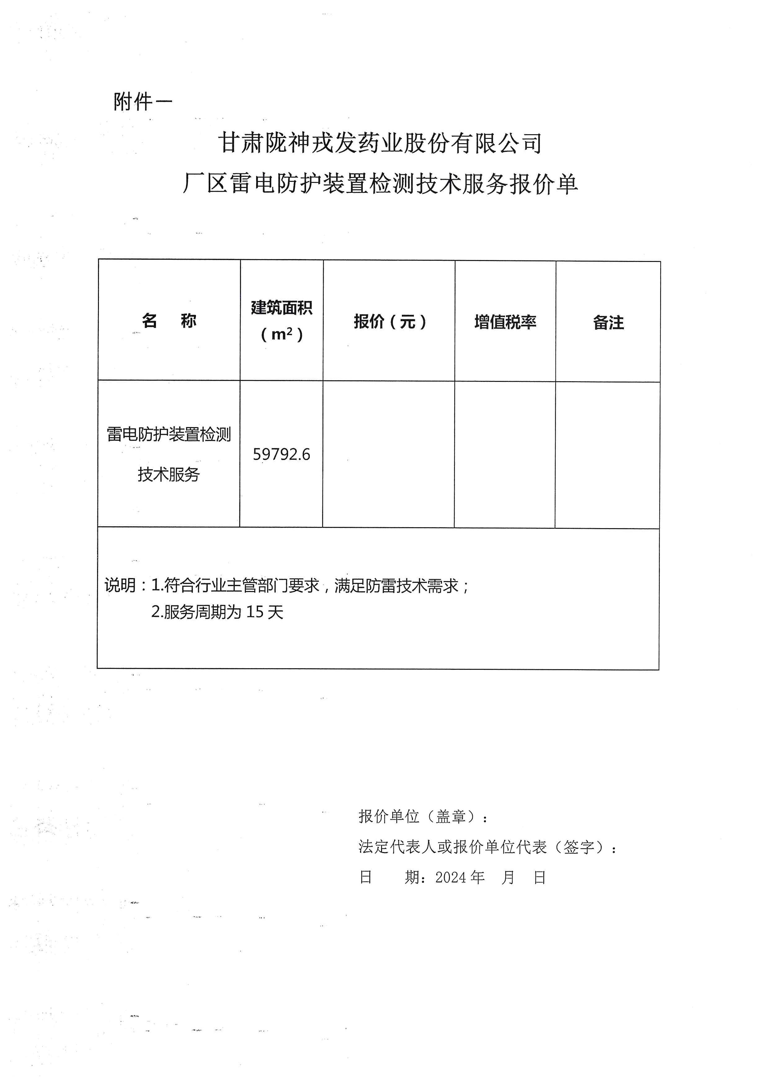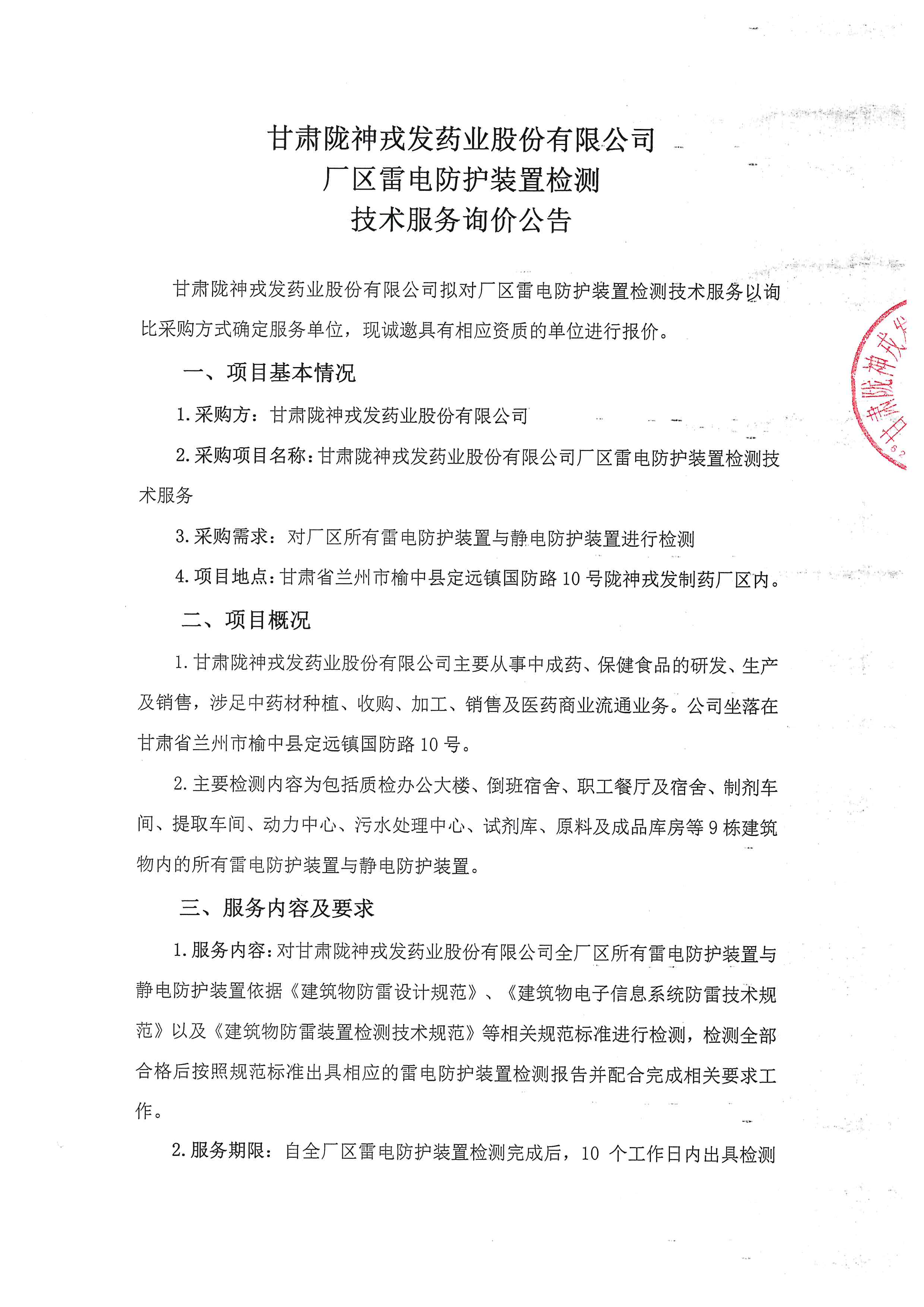甘肅隴神戎發(fā)藥業(yè)股份有限公司廠區(qū)雷電防護(hù)裝置檢測技術(shù)服務(wù)詢價(jià)公告
