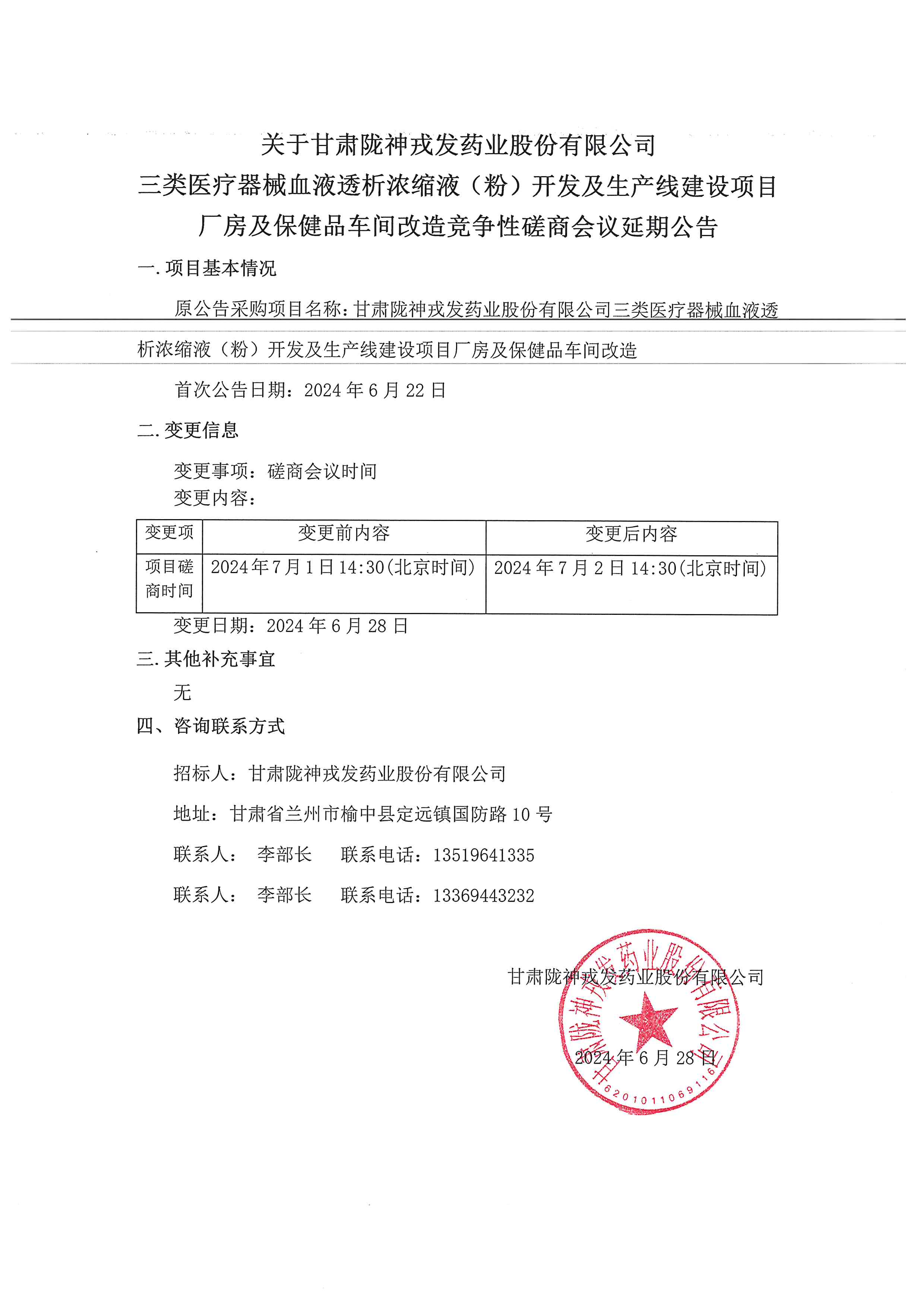 關于甘肅隴神戎發藥業股份有限公司三類醫療器械血液透析濃縮液(粉)開發及生產線建設項目廠房及保健品車間改造競爭性磋商會議延期公告