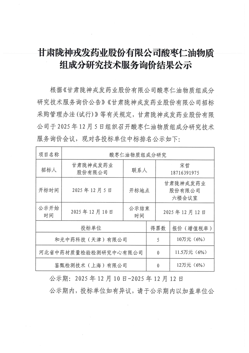 甘肅隴神戎發藥業股份有限公司酸棗仁油物質組成分研究技術服務詢價結果公示