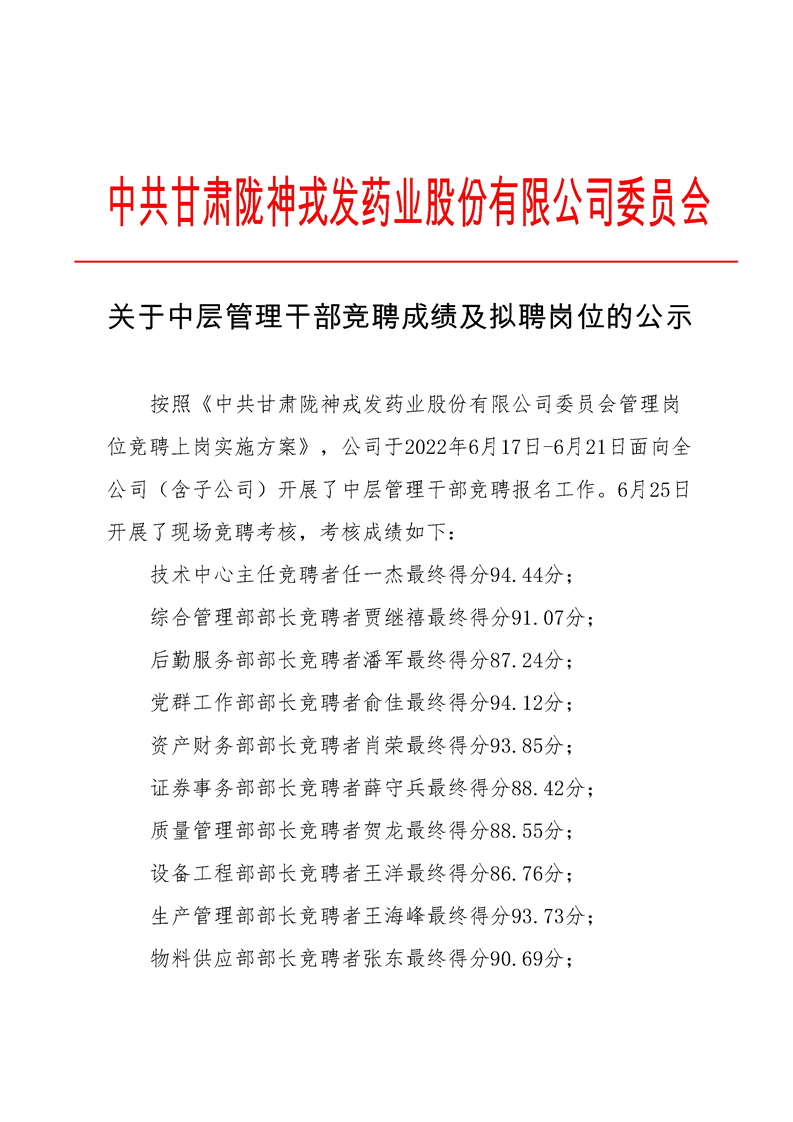 關于中層管理干部競聘成績及擬聘崗位的公示