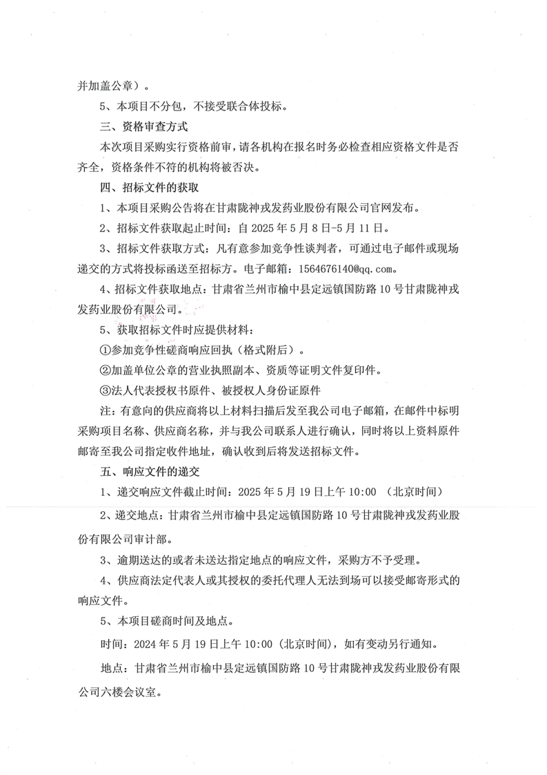 甘肅隴神戎發藥業股份有限公司三類醫療器械血液透析濃縮液(粉)運輸容器和系統的性能試驗機構選聘競爭性談判公告