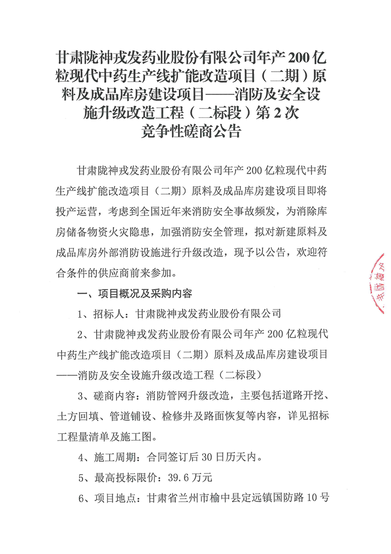 甘肅隴神戎發(fā)藥業(yè)股份有限公司年產(chǎn)200億粒現(xiàn)代中藥生產(chǎn)線擴(kuò)能改造項(xiàng)目(二期)原料及成品庫房建設(shè)項(xiàng)目——消防及安全設(shè)施升級(jí)改造工程(二標(biāo)段)第2次