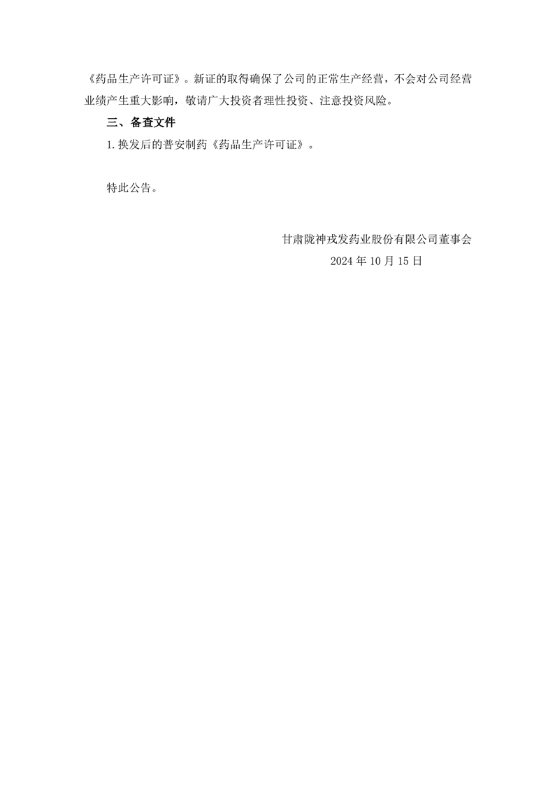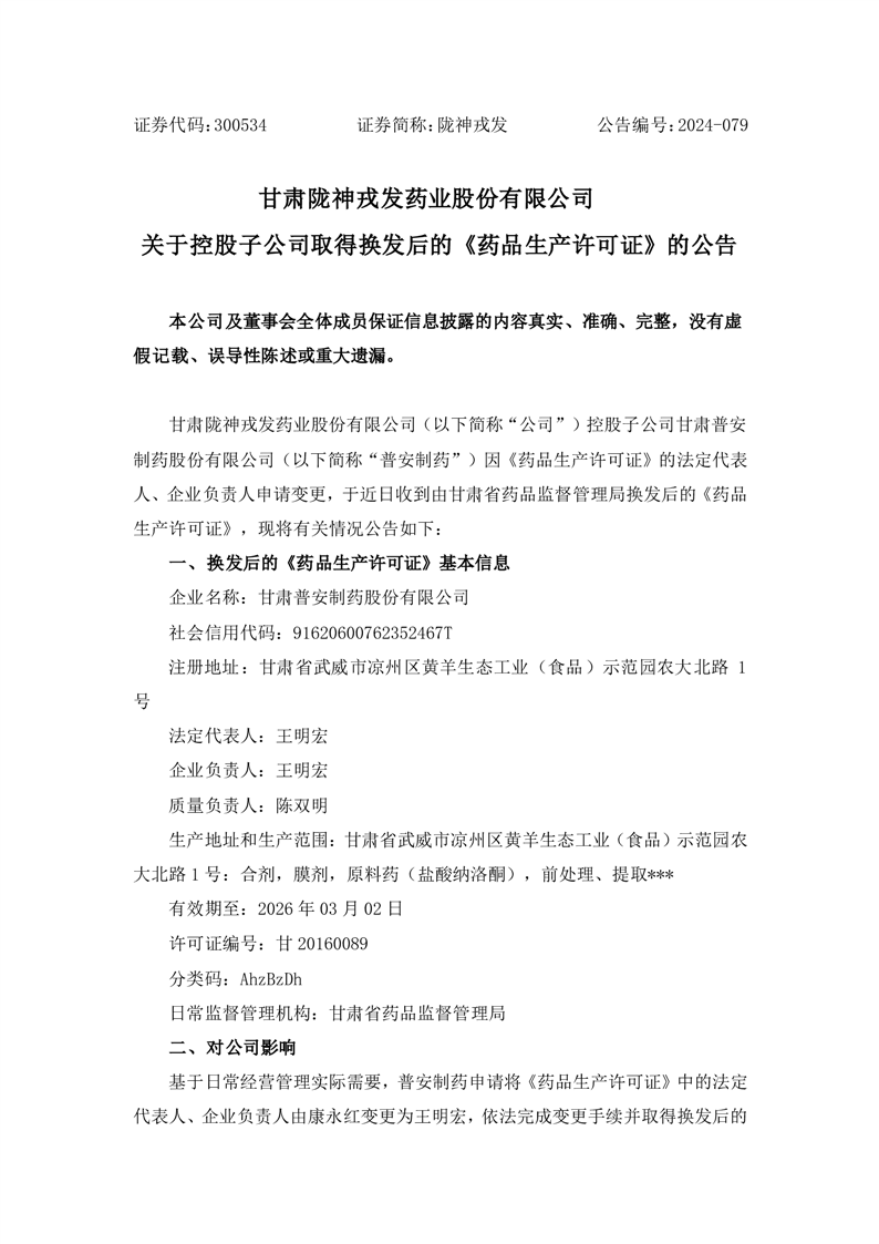 關于控股子公司取得換發后的《藥品生產許可證》的公告
