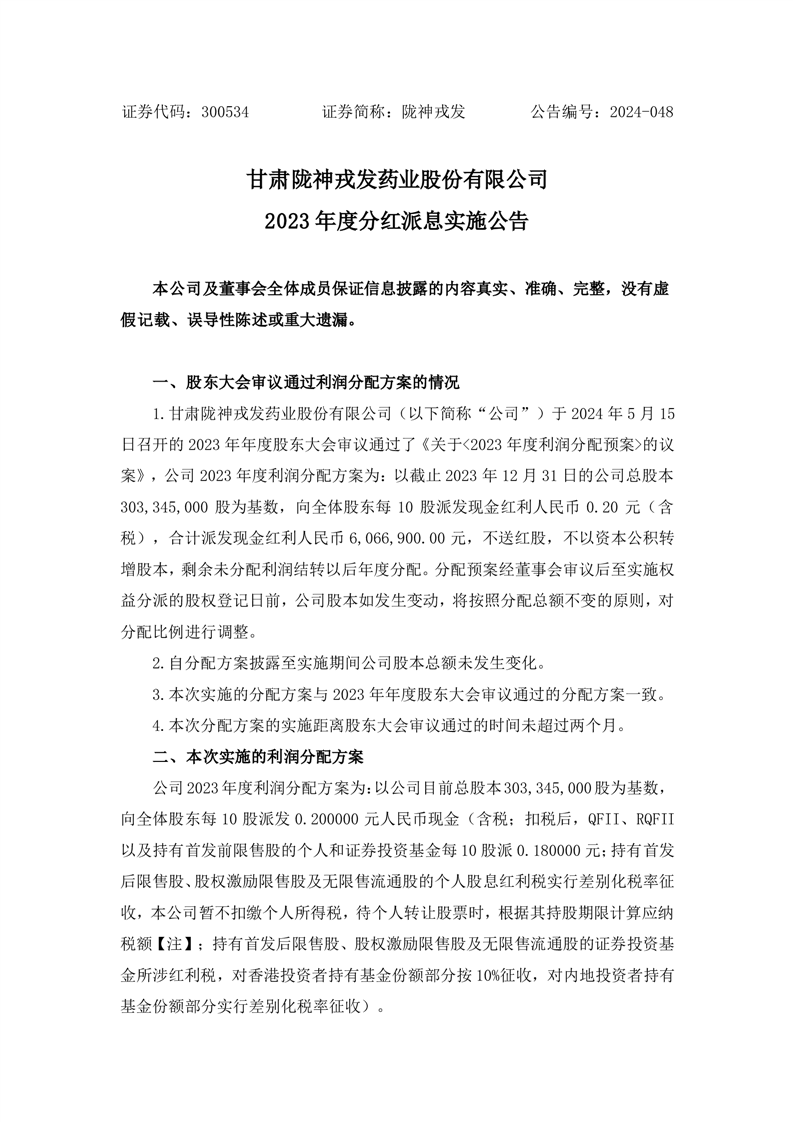 2023年度分紅派息實施公告