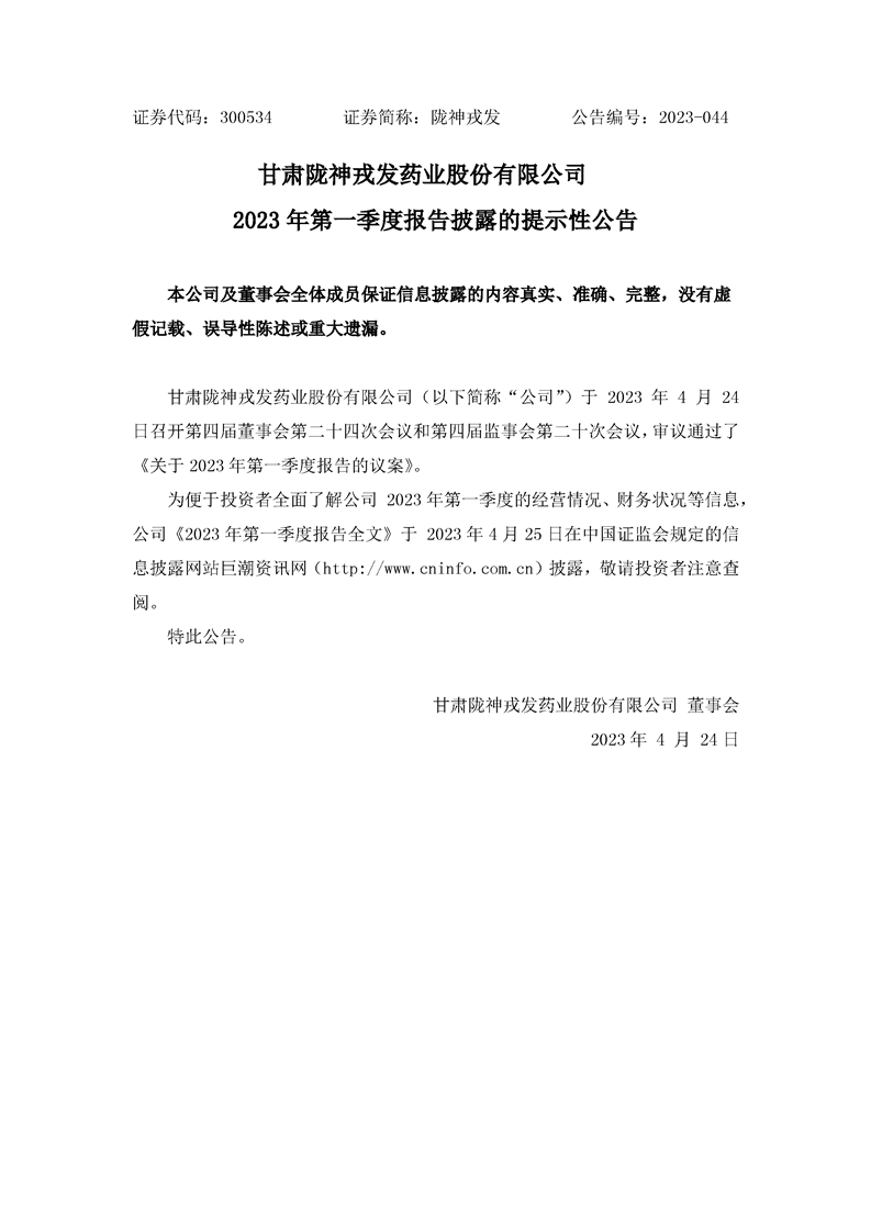 2023年第一季度報告披露的提示性公告