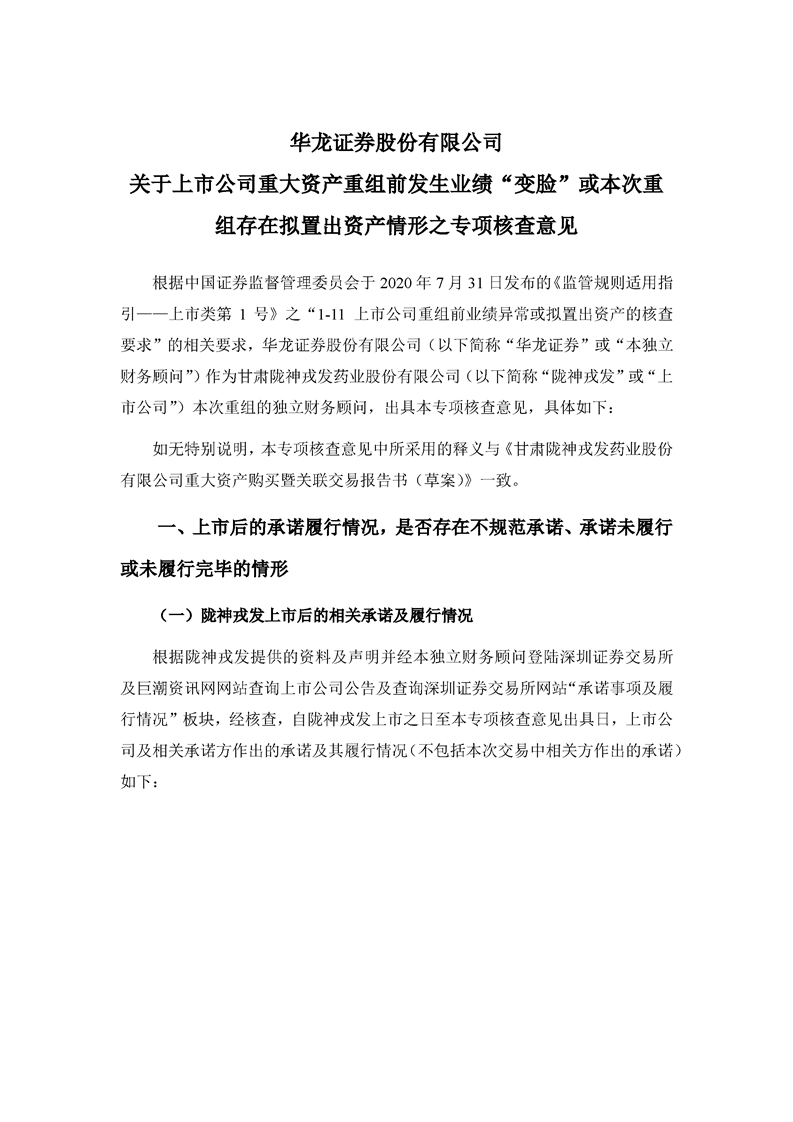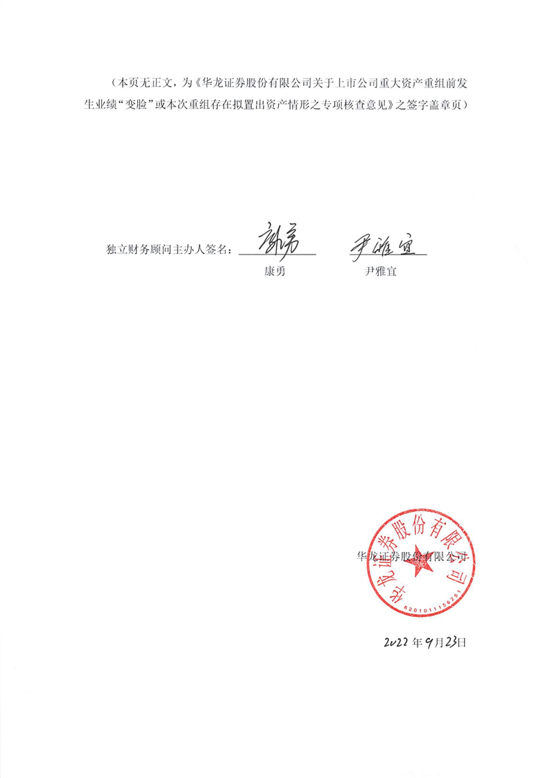 華龍證券股份有限公司關于上市公司重大資產重組前發生業績變臉或本次重組存在擬置出資產情形之專項核查意見