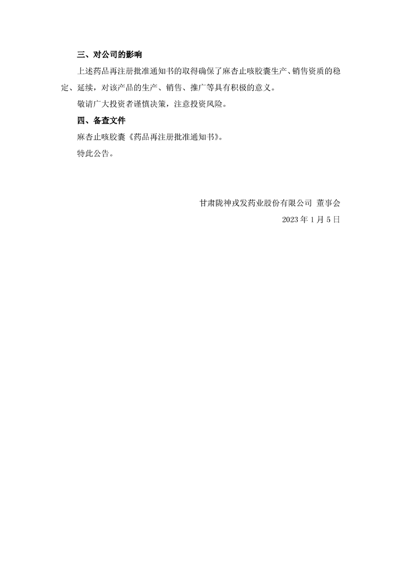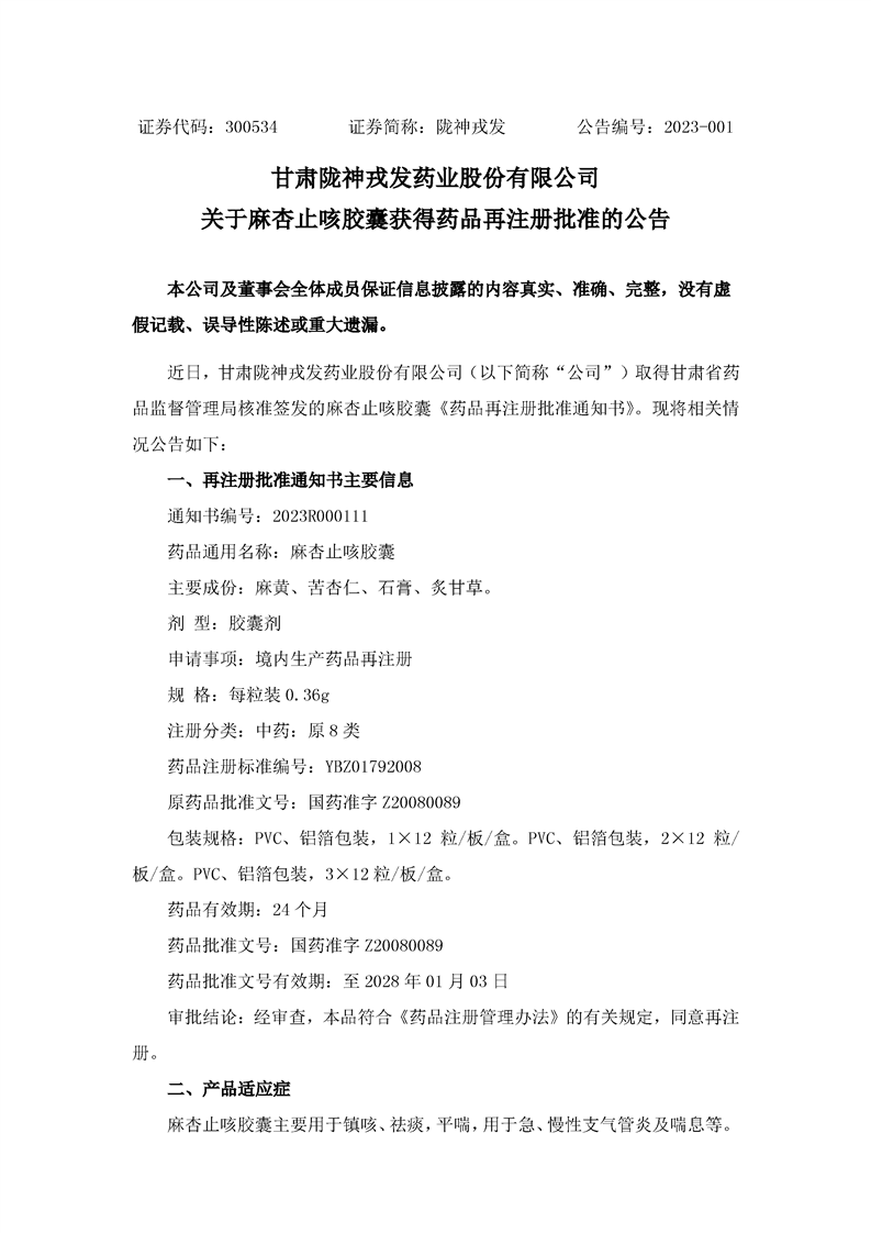 關于麻杏止咳膠囊獲得藥品再注冊批準的公告
