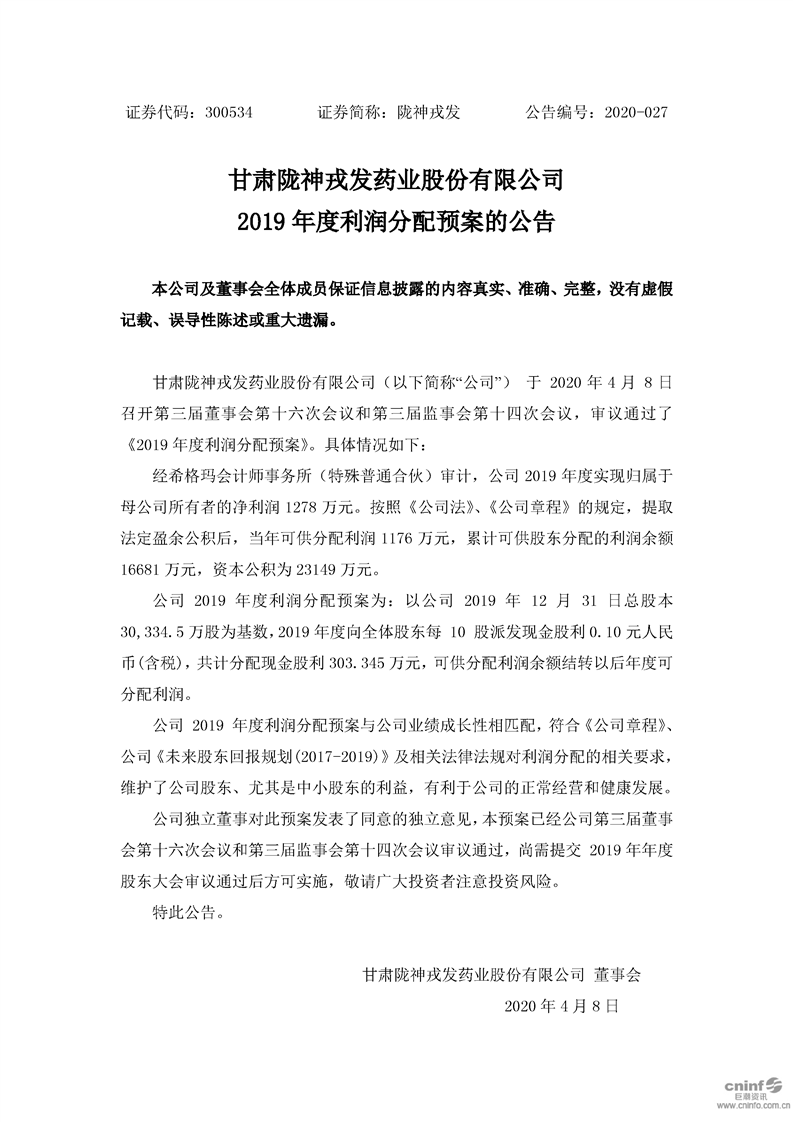 2019年度利潤分配預案的公告
