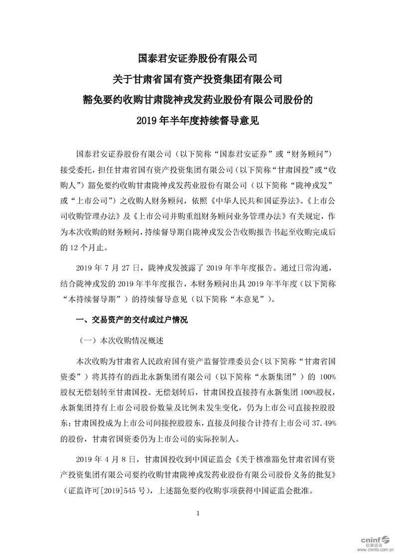 國泰君安證券股份有限公司關(guān)于甘肅省國有資產(chǎn)投資集團有限公司豁免要約收購公司股份的2019年半年度持續(xù)督導意見