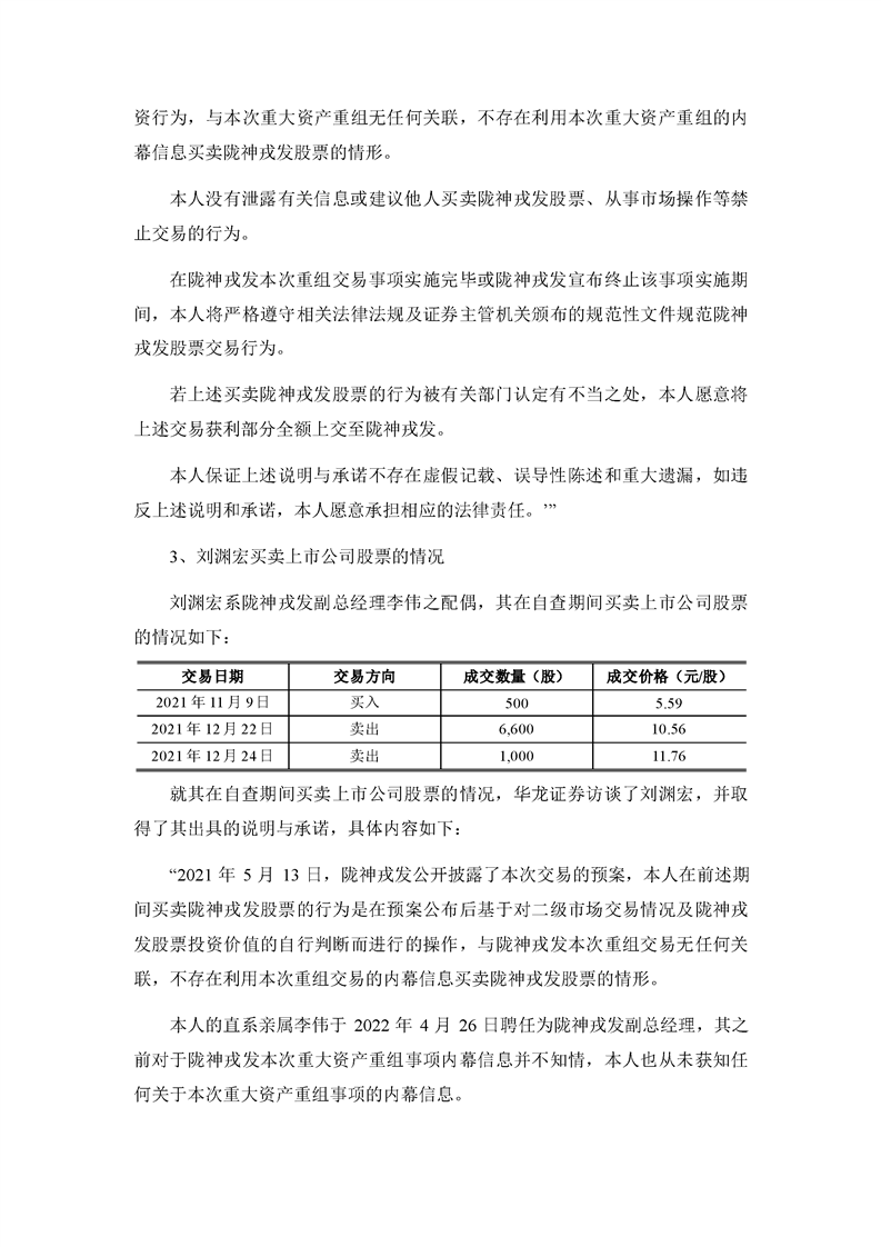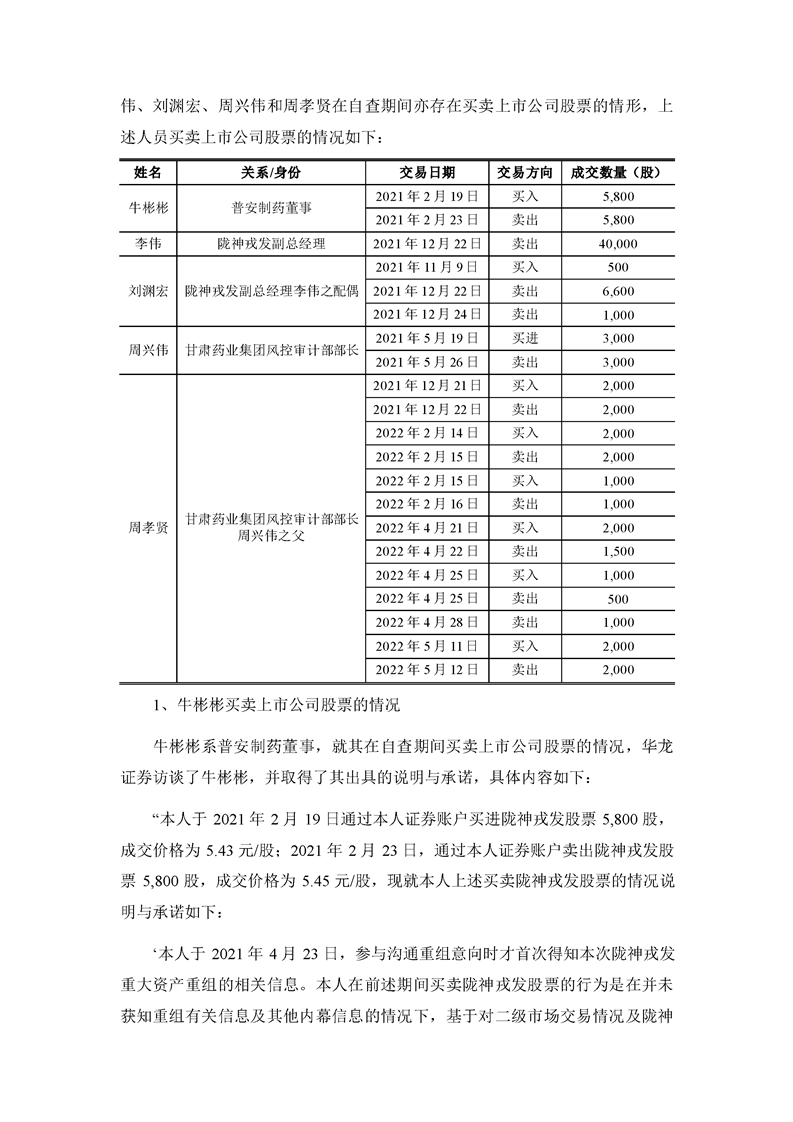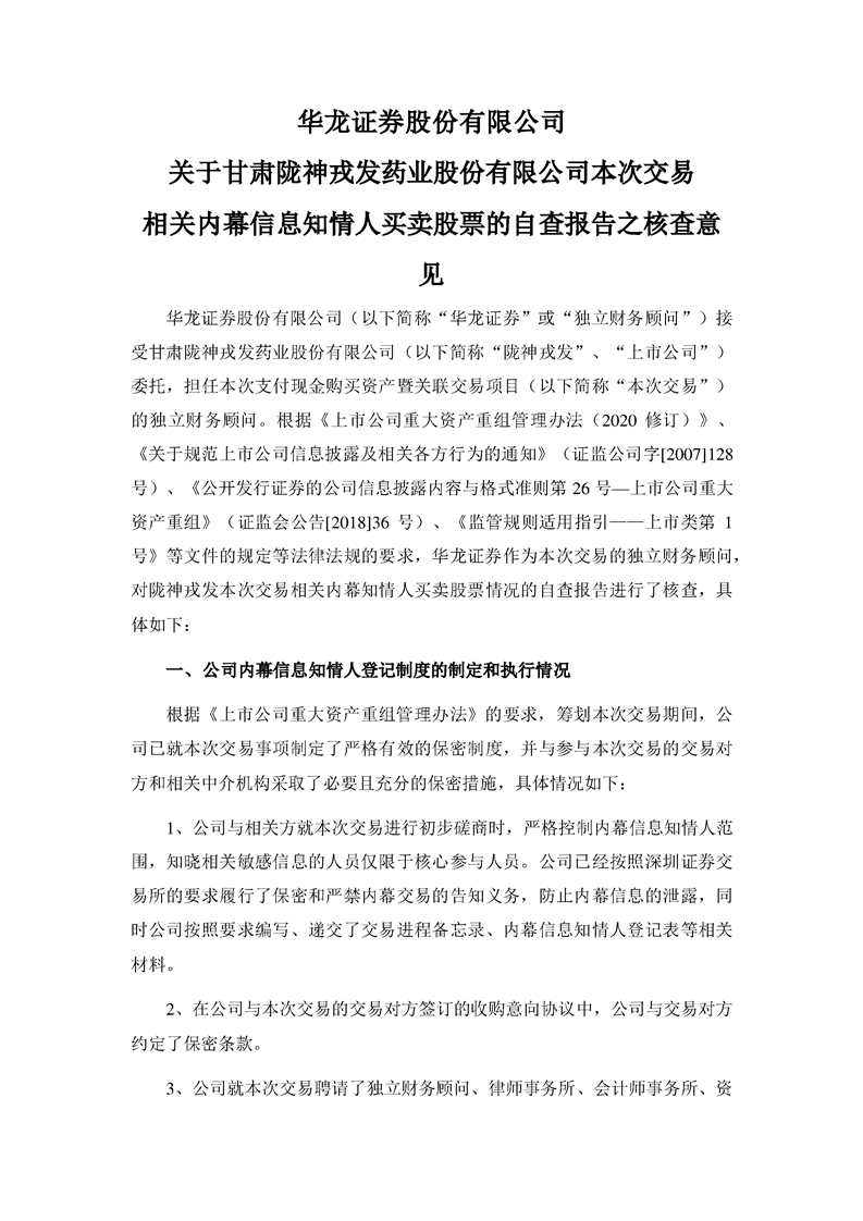 華龍證券股份有限公司關(guān)于甘肅隴神戎發(fā)藥業(yè)股份有限公司本次交易相關(guān)內(nèi)幕信息知情人買賣股票的自查報(bào)告之核查意見