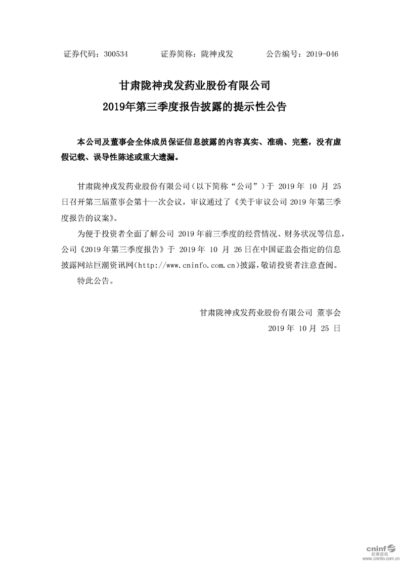 2019年第三季度報(bào)告披露的提示性公告