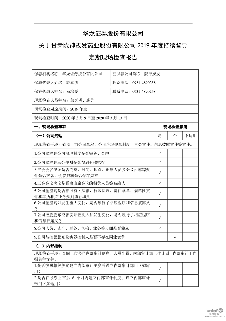 華龍證券股份有限公司關于公司2019年度持續督導定期現場檢查報告