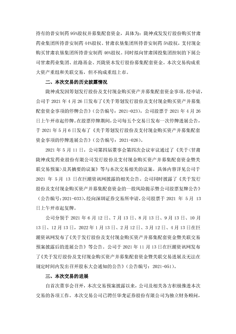 隴神戎發:關于發行股份及支付現金購買資產并募集配套資金暨關聯交易預案披露后的進展公告
