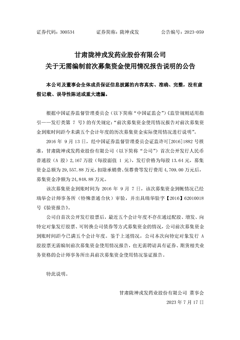 關(guān)于無需編制前次募集資金使用情況報告說明的公告