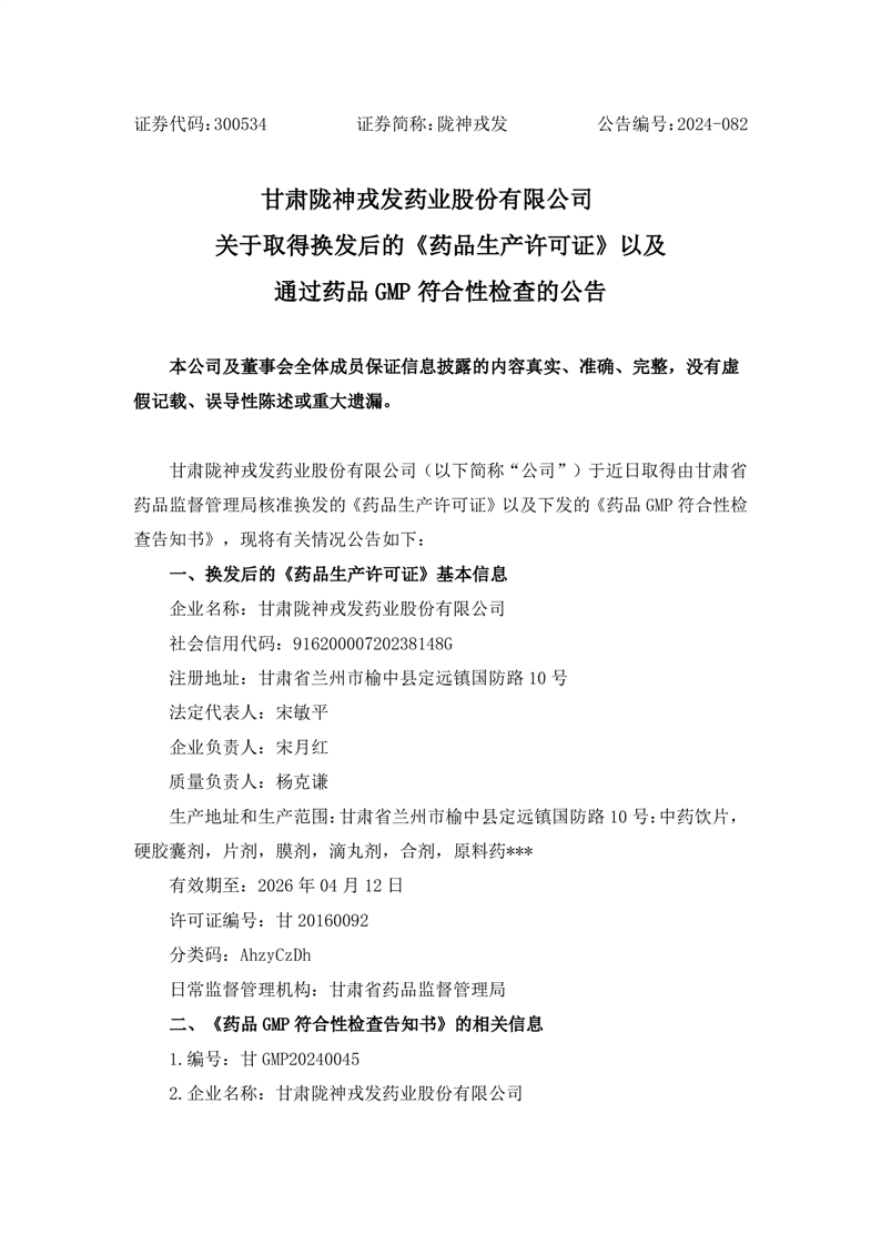 關于取得換發后的《藥品生產許可證》以及通過藥品GMP符合性檢查的公告