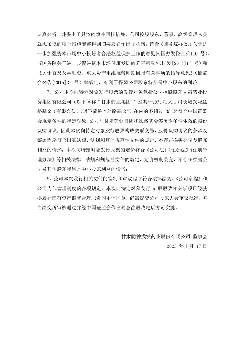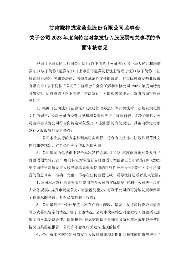 監事會關于公司2023年度向特定對象發行A股股票相關事項的書面審核意見