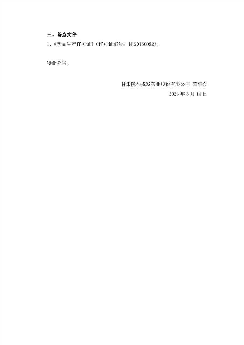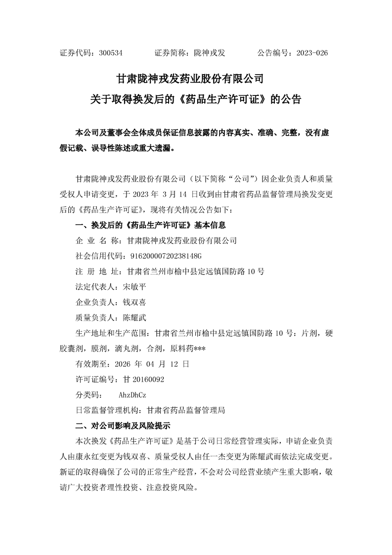 關于取得換發后的《藥品生產許可證》的公告