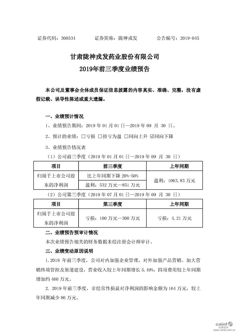 2019年前三季度業績預告