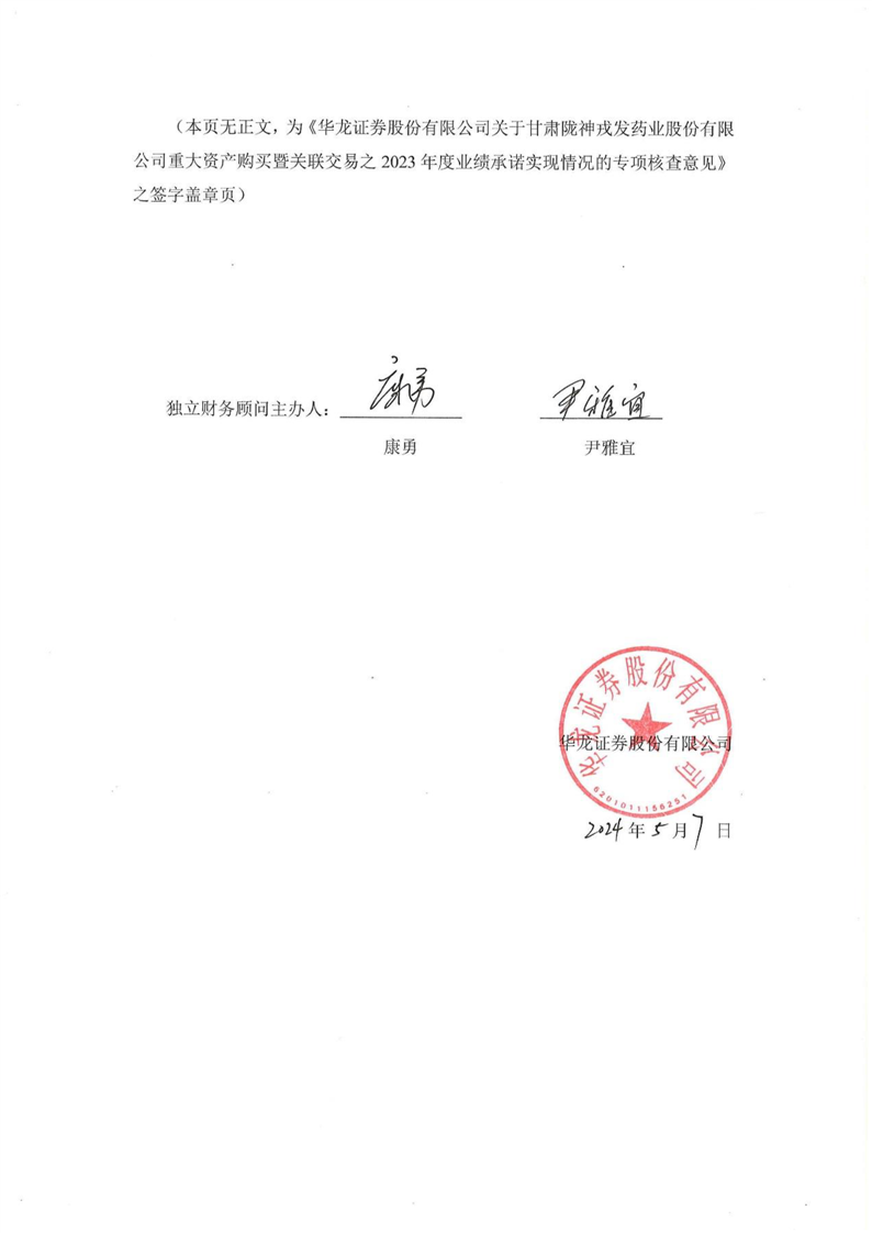華龍證券股份有限公司關于甘肅隴神戎發藥業股份有限公司重大資產購買暨關聯交易之2023年度業績承諾實現情況的專項核查意見(更正后)