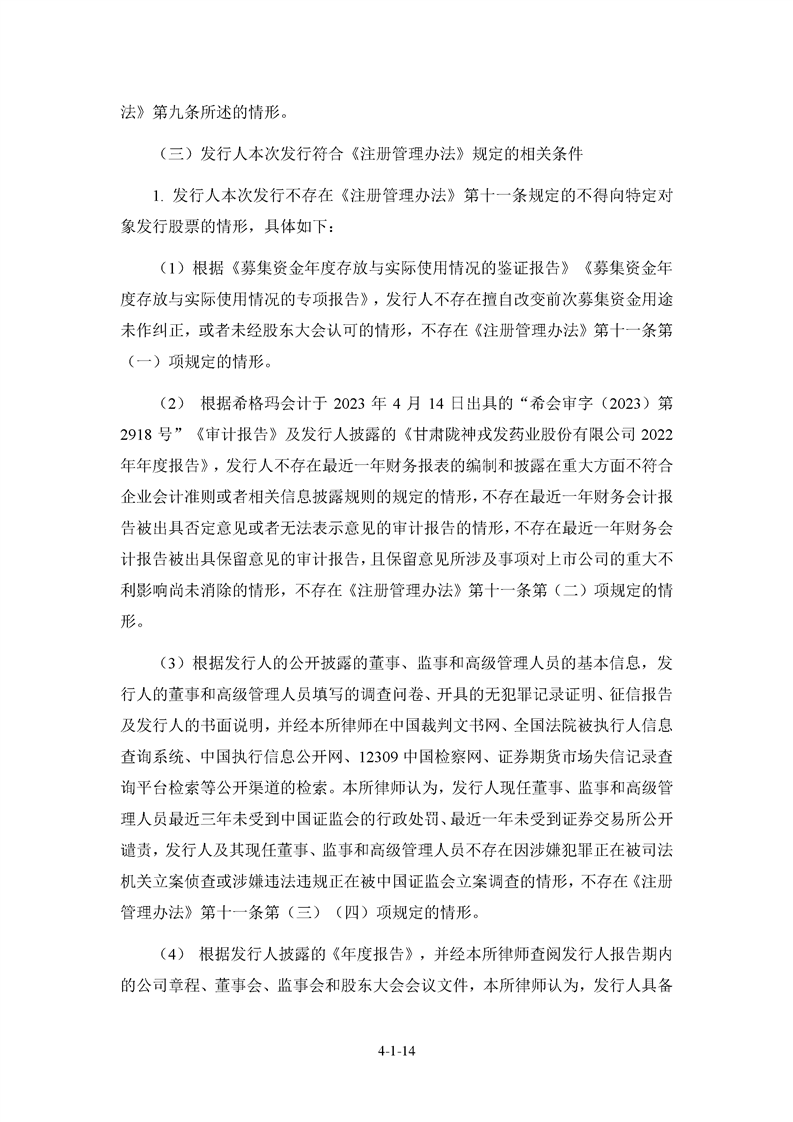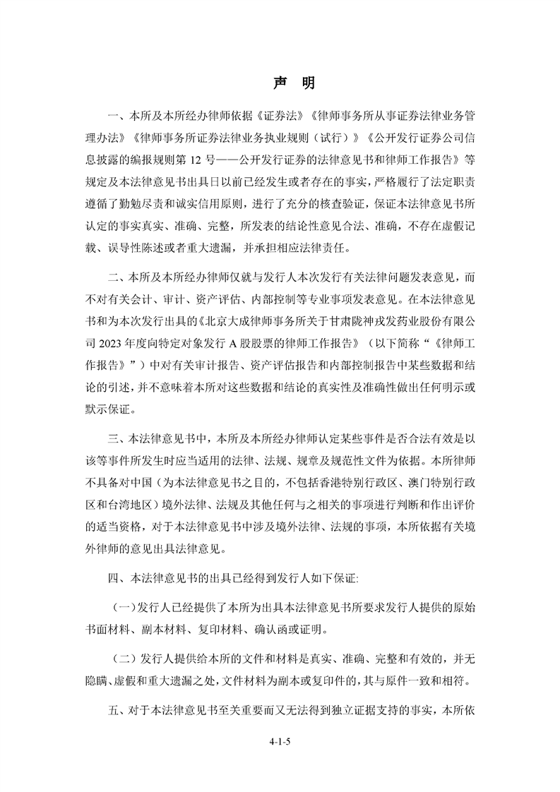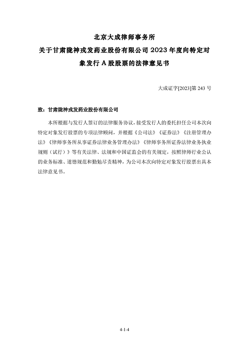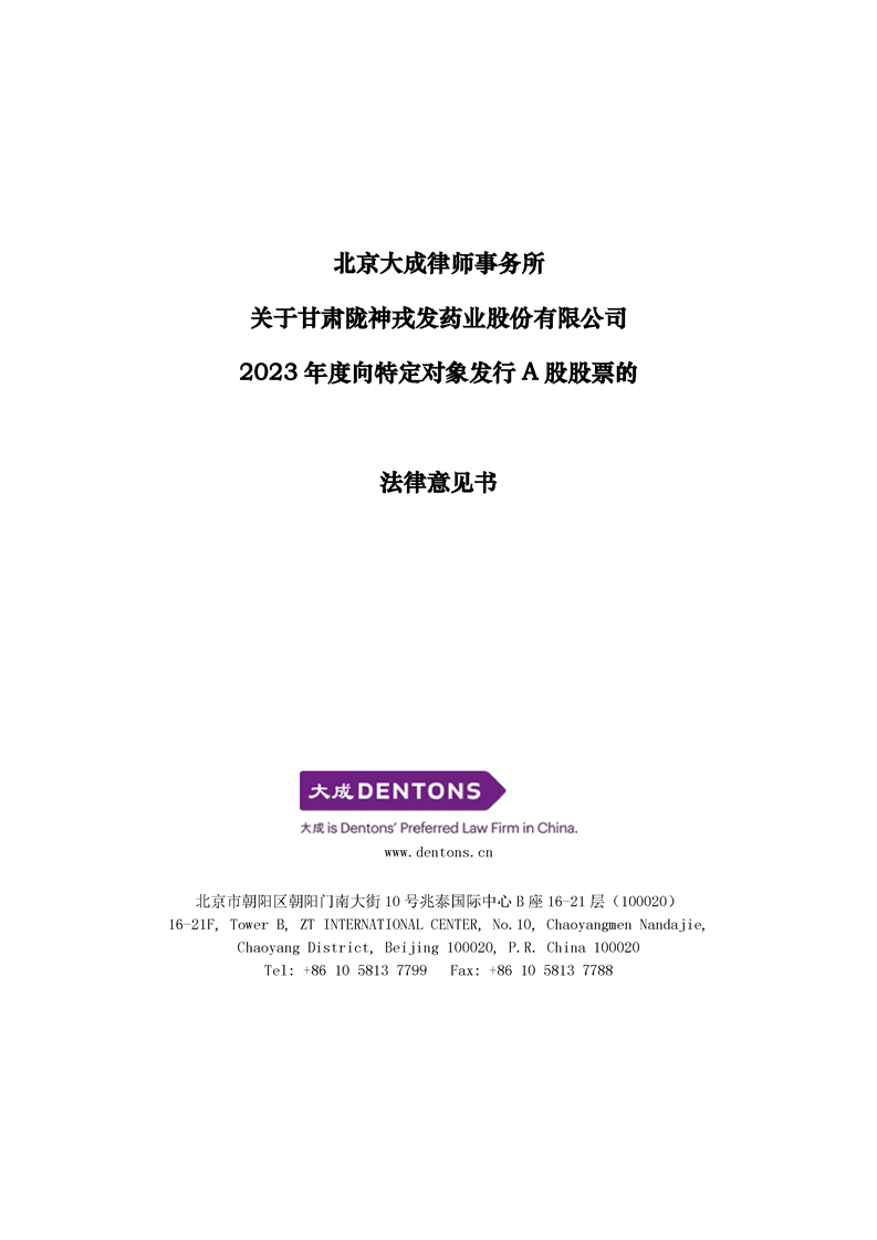 北京大成律師事務(wù)所關(guān)于甘肅隴神戎發(fā)藥業(yè)股份有限公司2023年度向特定對象發(fā)行A股股票的法律意見書