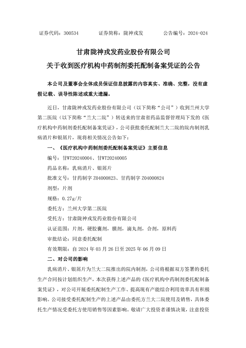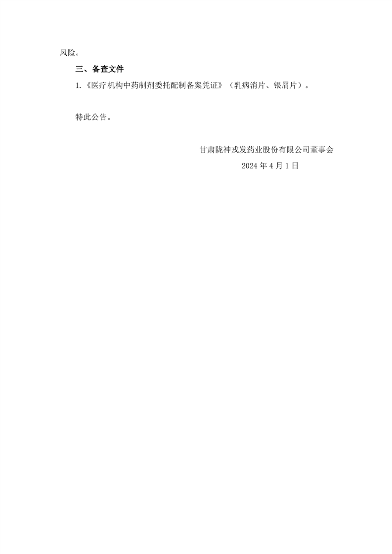 關于收到醫療機構中藥制劑委托配制備案憑證的公告