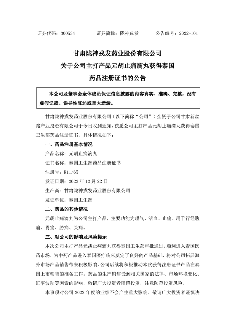 關于公司主打產品元胡止痛滴丸獲得泰國藥品注冊證書的公告
