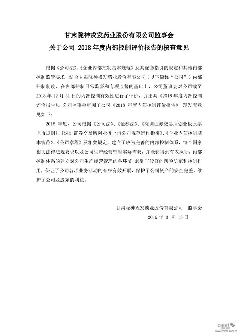 監事會 關于公司 2018 年度內部控制評價報告的核查意見