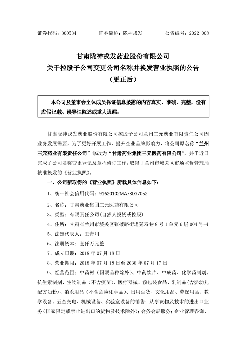 關(guān)于控股子公司變更公司名稱并換發(fā)營(yíng)業(yè)執(zhí)照的公告(更正后)