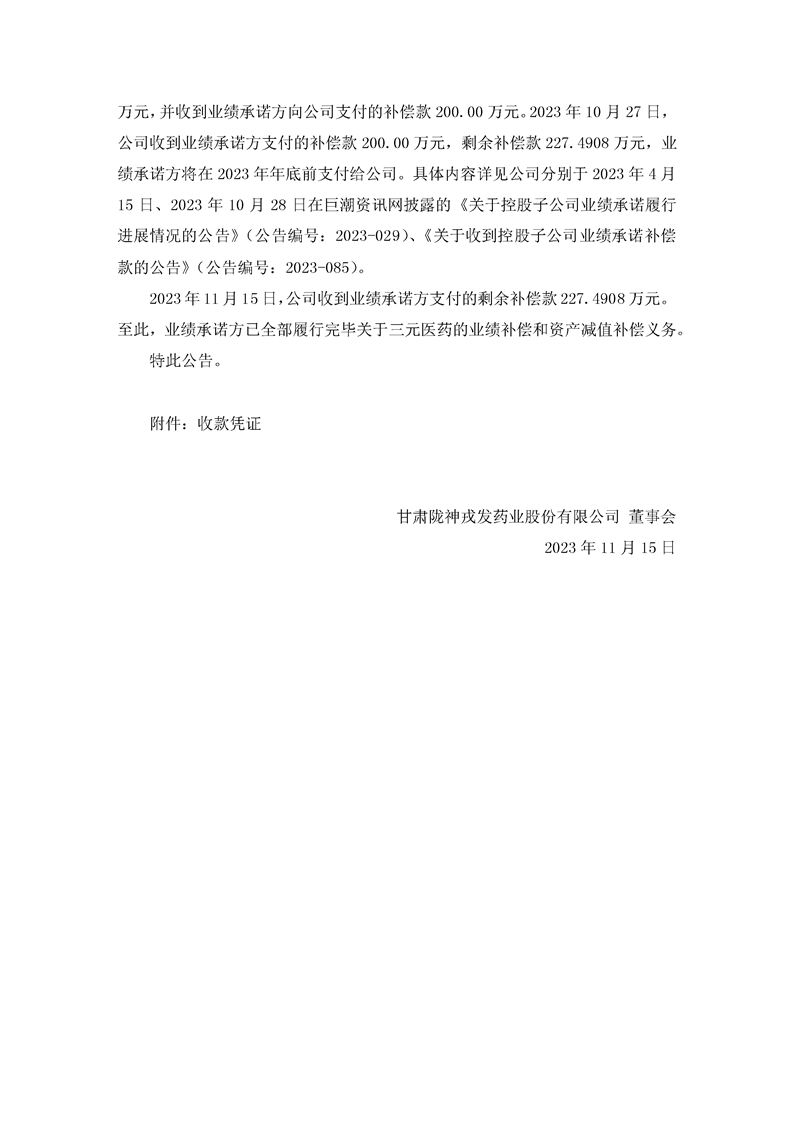 關于收到控股子公司業(yè)績承諾補償款的公告