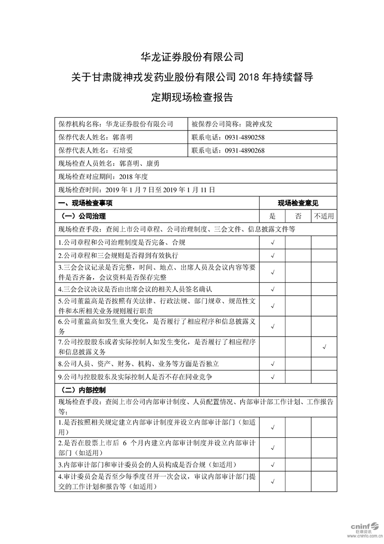 華龍證券股份有限公司關于甘肅隴神戎發藥業股份有限公司 2018 年持續督導定期現場檢查報告