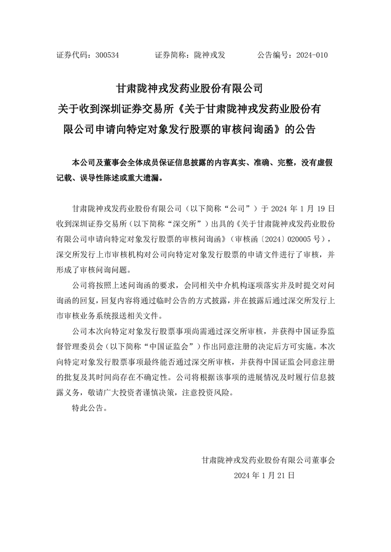 關于收到深圳證券交易所《關于甘肅隴神戎發藥業股份有限公司申請向特定對象發行股票的審核問詢函》的公告
