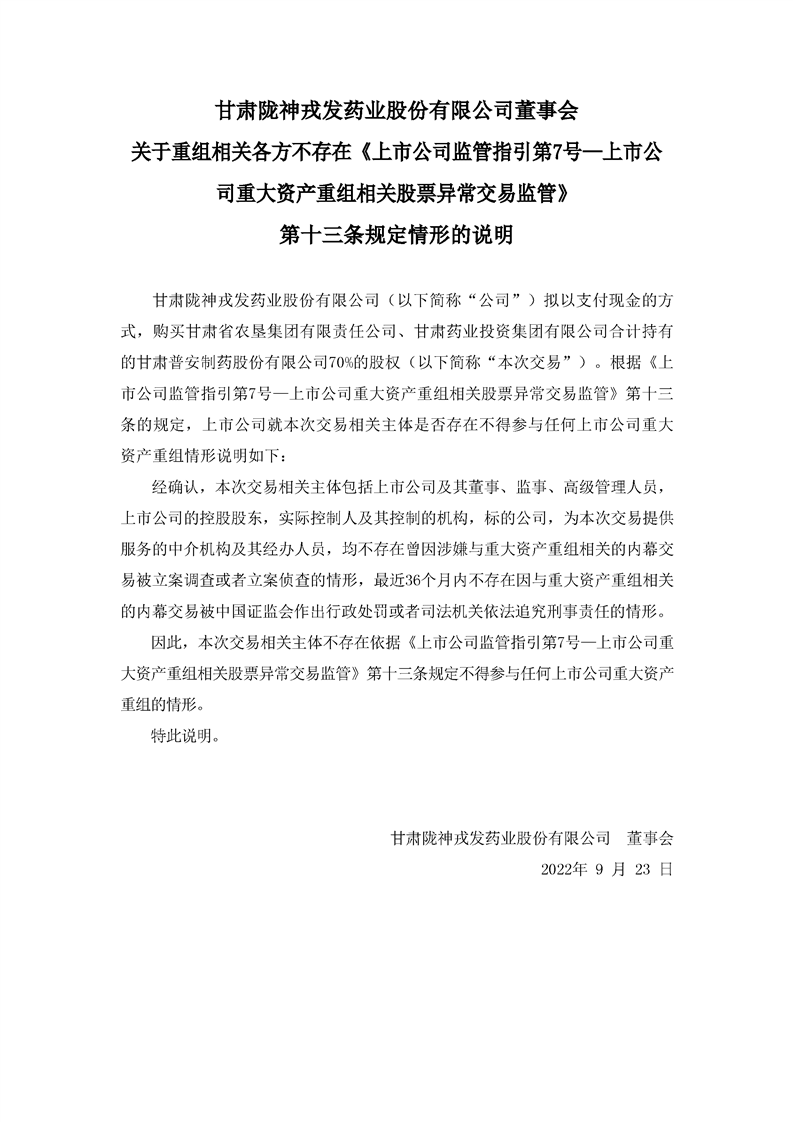隴神戎發(fā):董事會(huì)關(guān)于重組相關(guān)各方不存在《上市公司監(jiān)管指引第7號(hào)—上市公司重大資產(chǎn)重組相關(guān)股票異常交易監(jiān)管》第十三條規(guī)定情形的說明