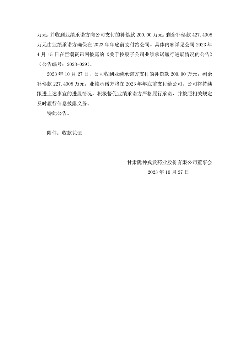 關(guān)于收到控股子公司業(yè)績承諾補償款的公告