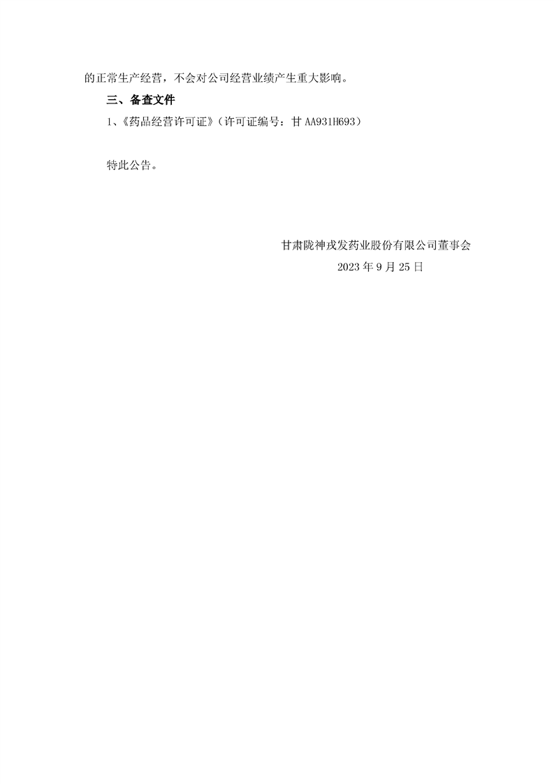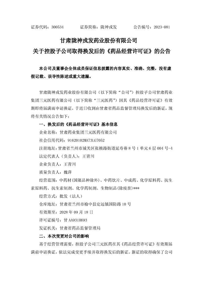 關于控股子公司取得換發后的《藥品經營許可證》的公告