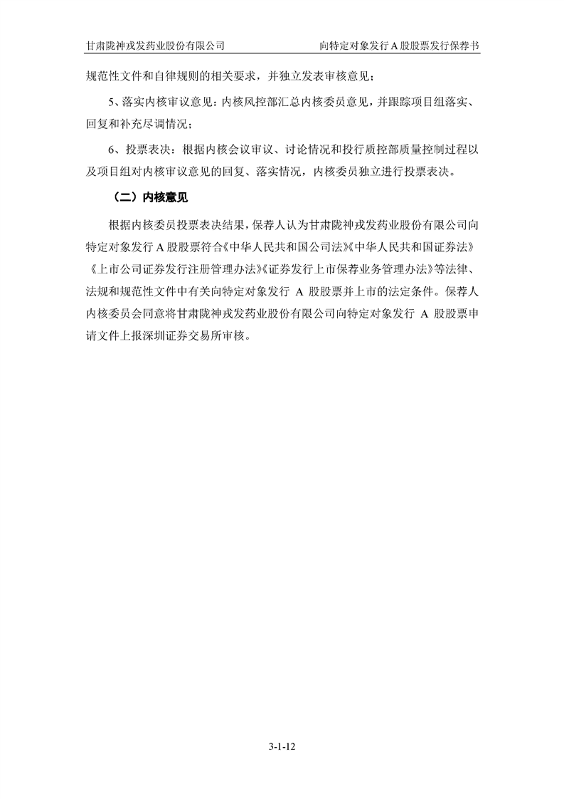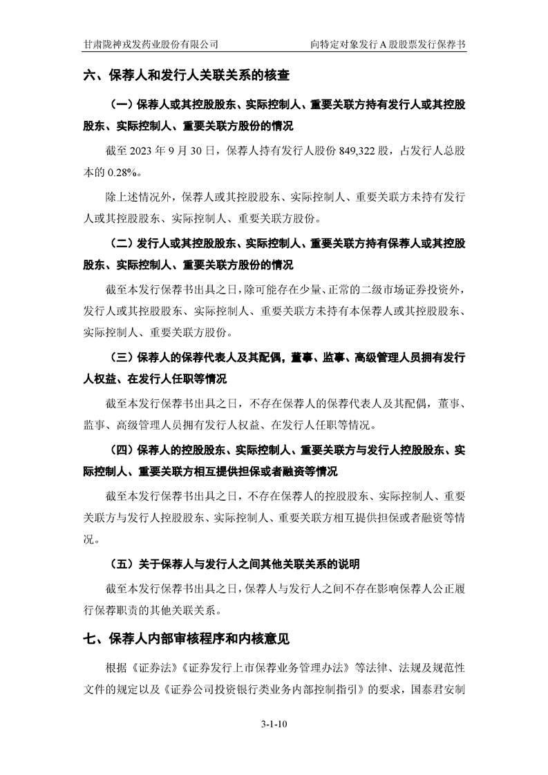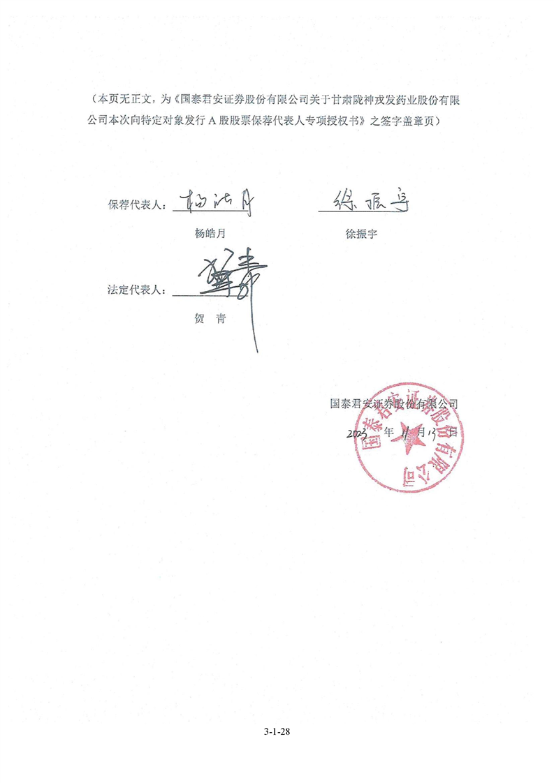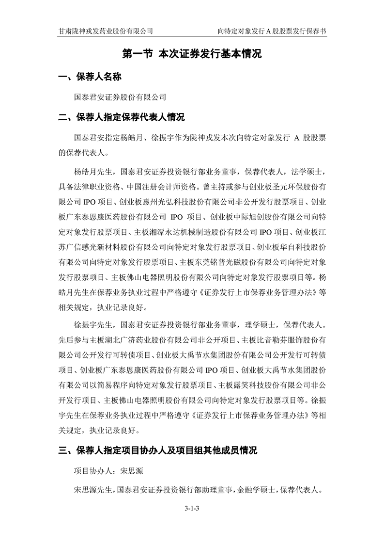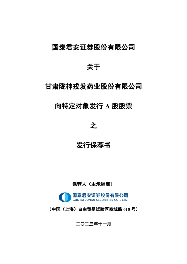 國泰君安證券股份有限公司關于甘肅隴神戎發藥業股份有限公司向特定對象發行A股股票之發行保薦書